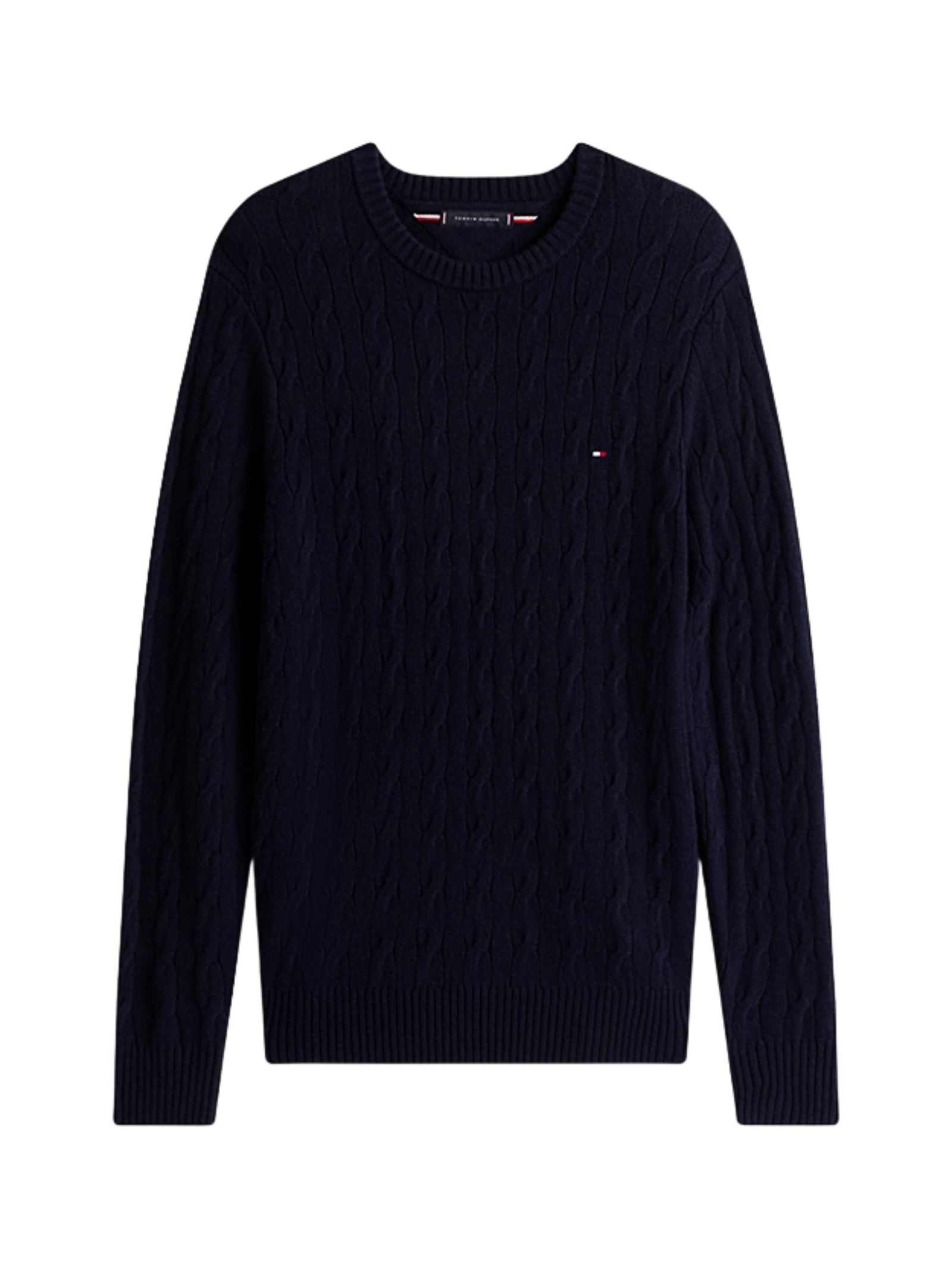 Pullover blu in pura lana dagnello con lavorazione a maglia intrecciata all over, girocollo, collo, polsini e fondo a coste, dettaglio iconico interno al collo, branding e bandierina Tommy Hilfiger ricamata sul petto; vestibilità regular fit con spalle leggermente scese; 100% lana dagnello.