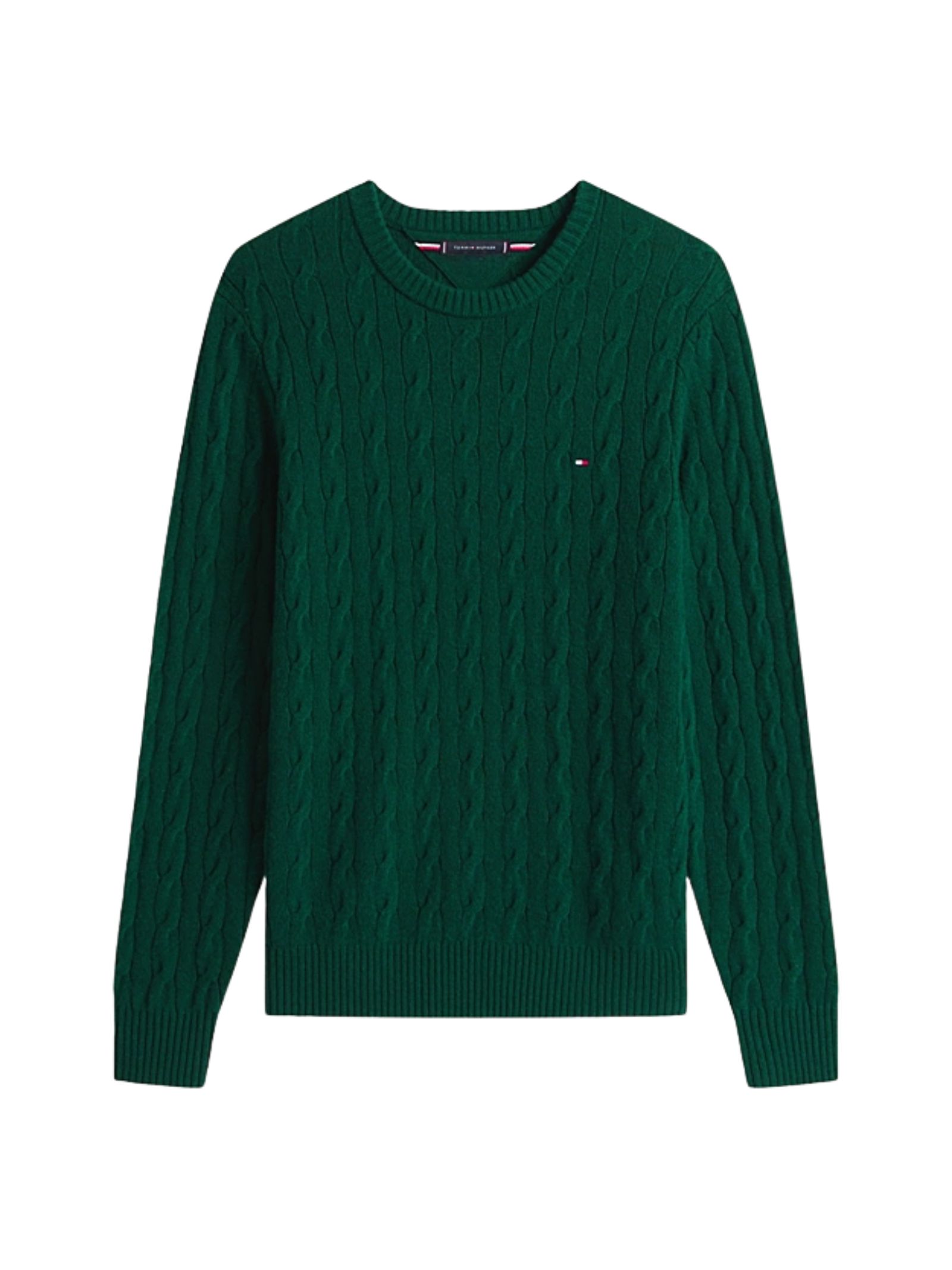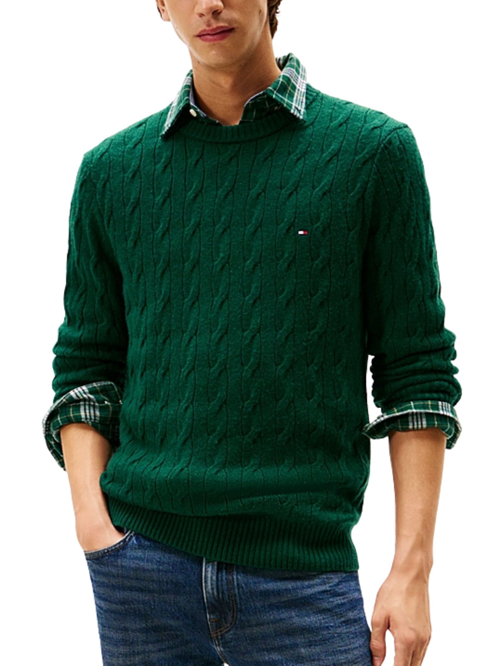 Pullover verde in pura lana dagnello con lavorazione a maglia intrecciata all over, girocollo, collo, polsini e fondo a coste, dettaglio iconico interno al collo, branding e bandierina Tommy Hilfiger ricamata sul petto; vestibilità regular fit con spalle leggermente scese; 100% lana dagnello.