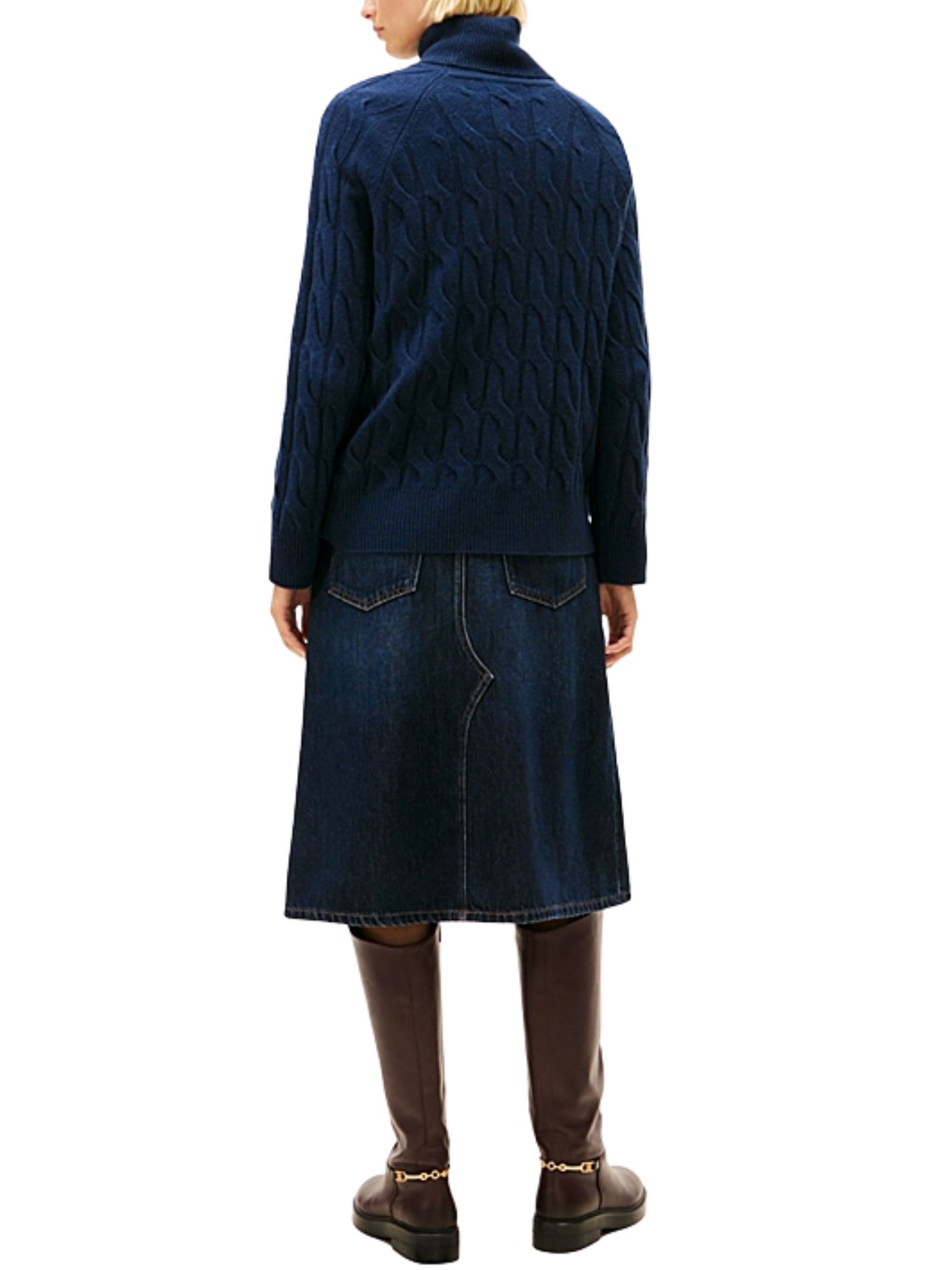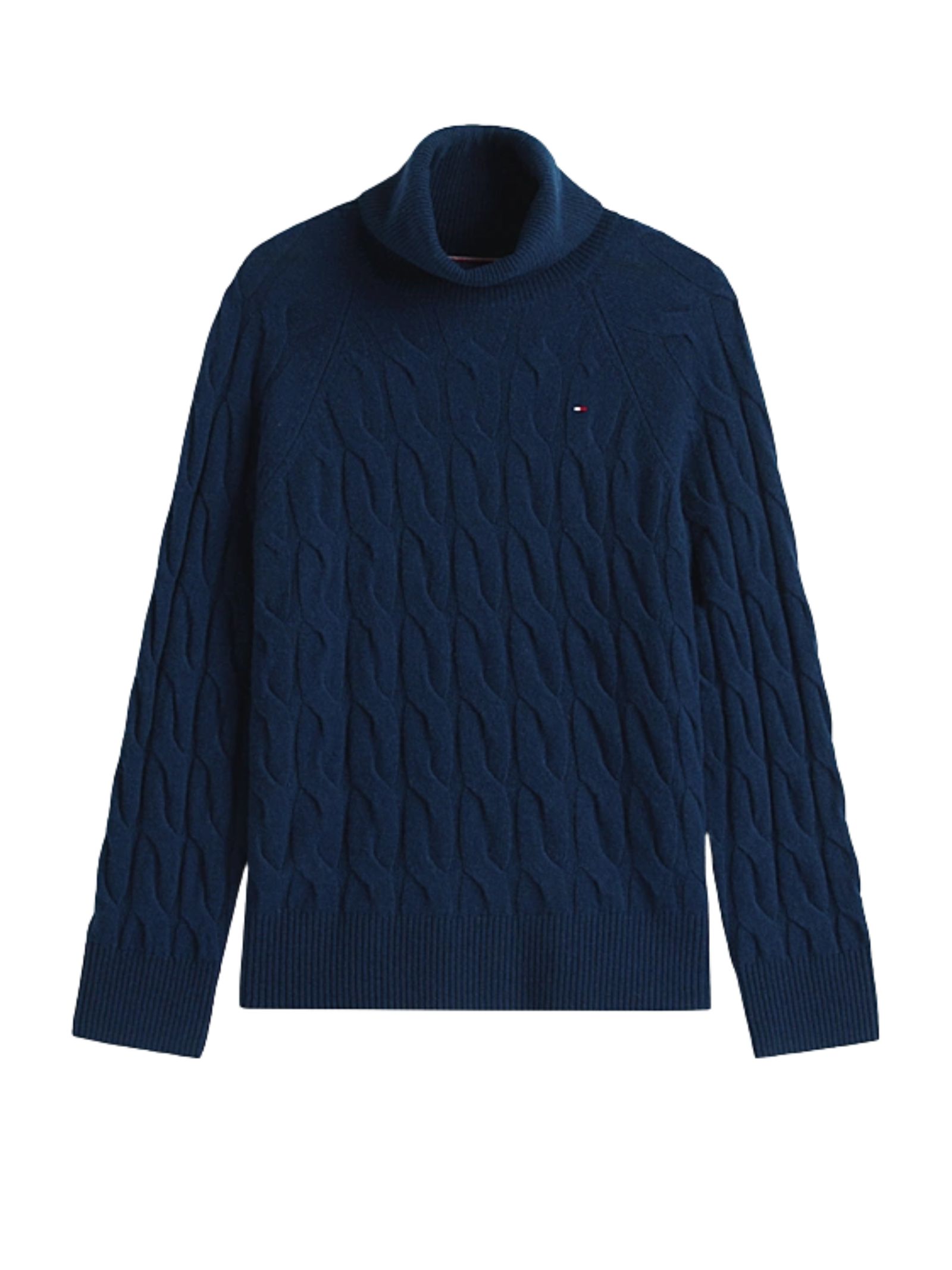 Pullover blu dolcevita in morbida pura lana con lavorazione intrecciata oversize, per uno stile moderno e distintivo. Realizzato al 100% in lana, presenta collo dolcevita, collo, polsini e fondo a coste, e bandierina Tommy Hilfiger ricamata sul petto. Vestibilità relaxed con maniche raglan.