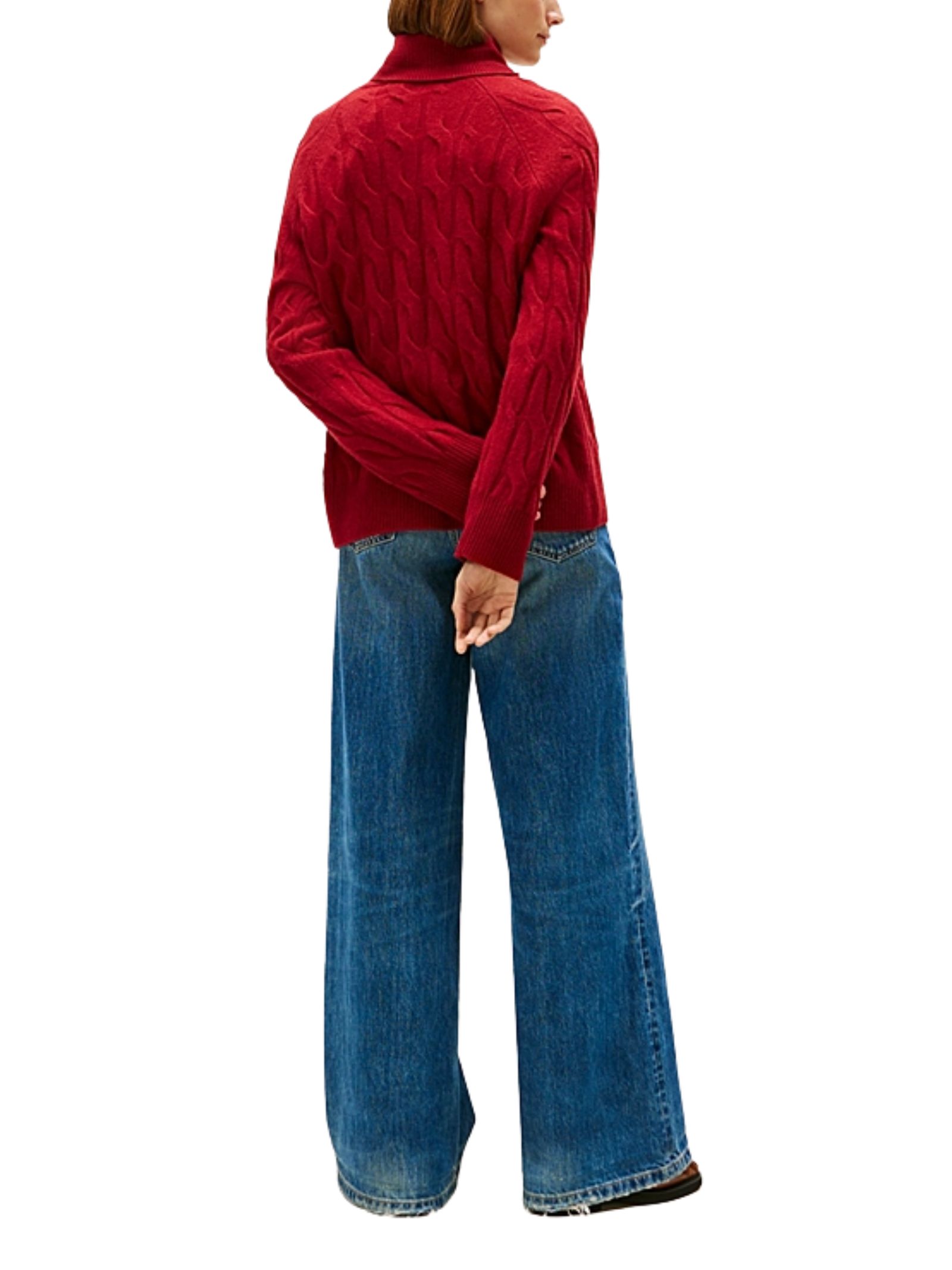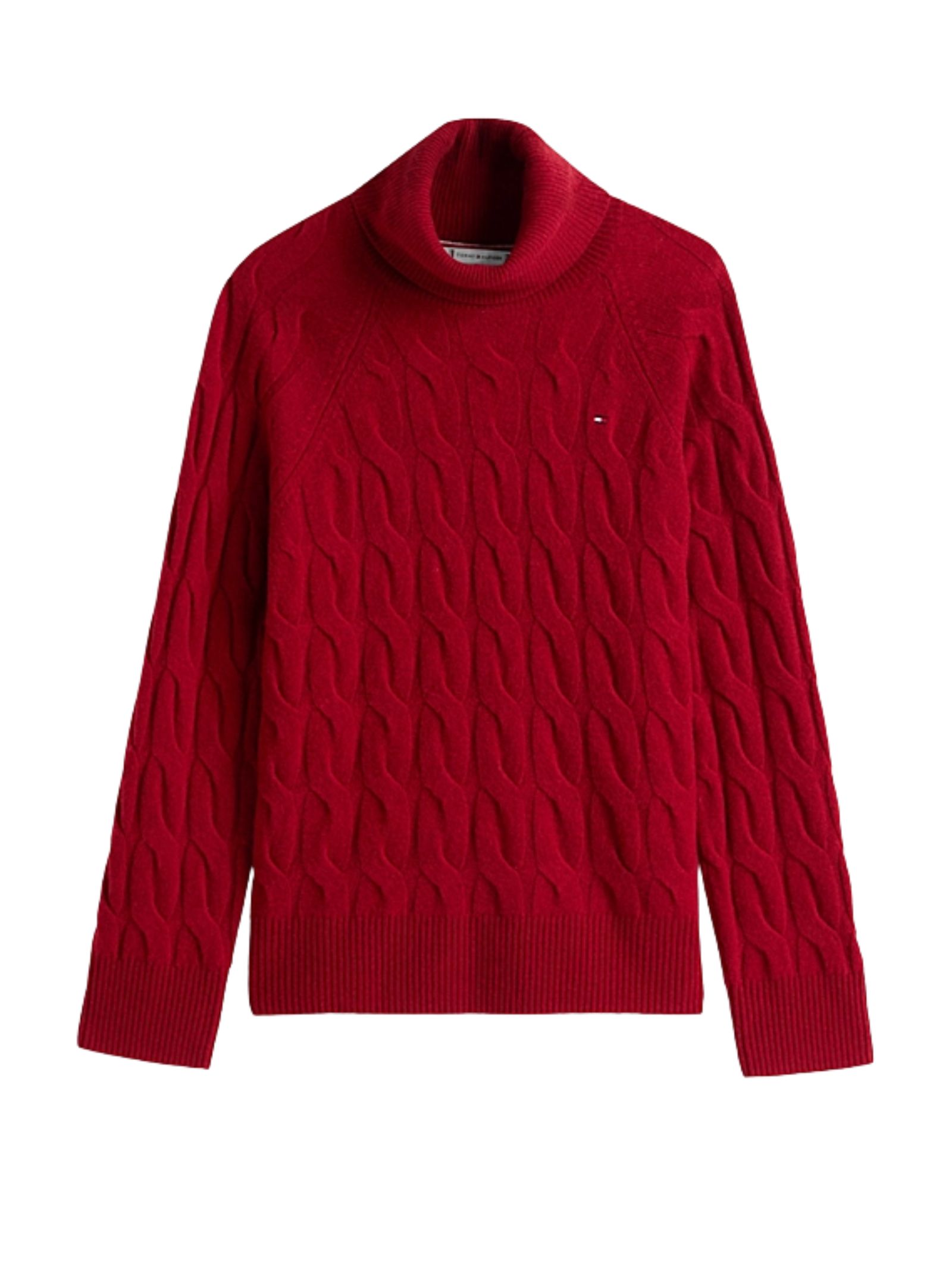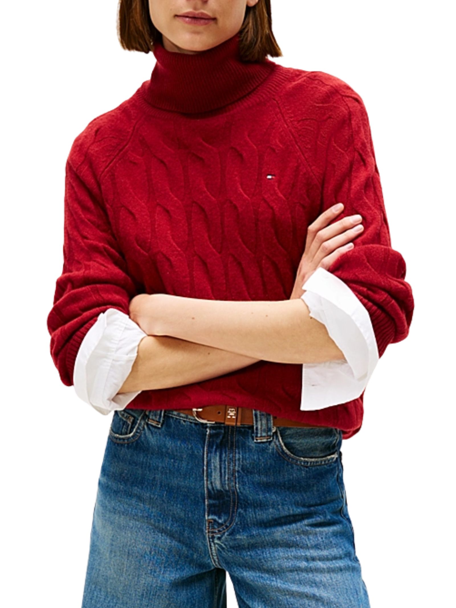 Pullover dolcevita rosso in morbida pura lana con lavorazione intrecciata oversize, per uno stile moderno e distintivo. Realizzato al 100% in lana, presenta collo dolcevita, collo, polsini e fondo a coste, e bandierina Tommy Hilfiger ricamata sul petto. Vestibilità relaxed con maniche raglan.