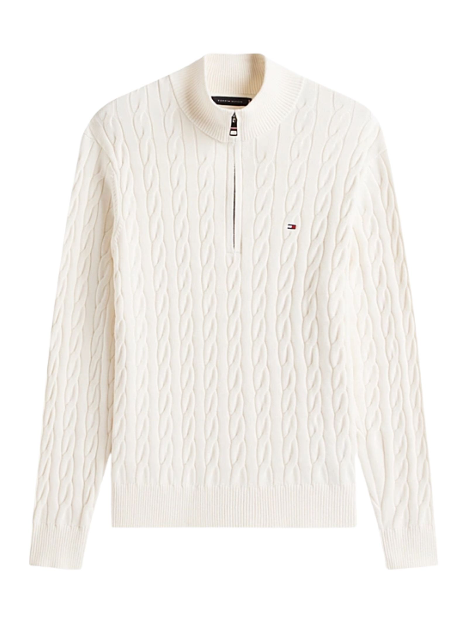 Pullover avorio in puro cotone pettinato con lavorazione a maglia intrecciata, collo a lupetto con mezza zip, collo, polsini e fondo a coste, branding e bandierina Tommy Hilfiger ricamata sul petto; vestibilità regular fit; 100% cotone.