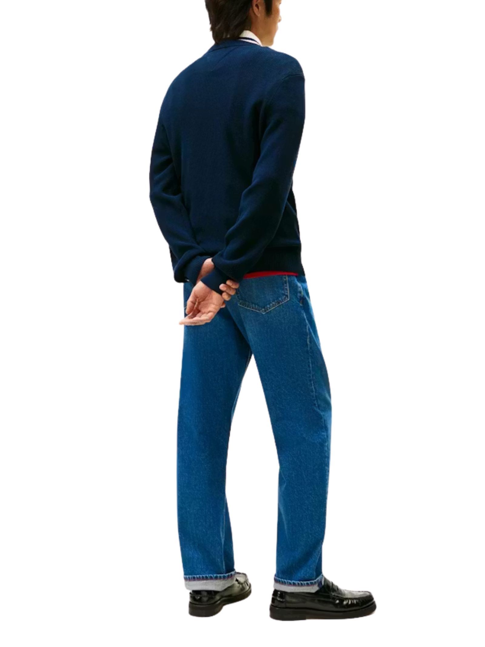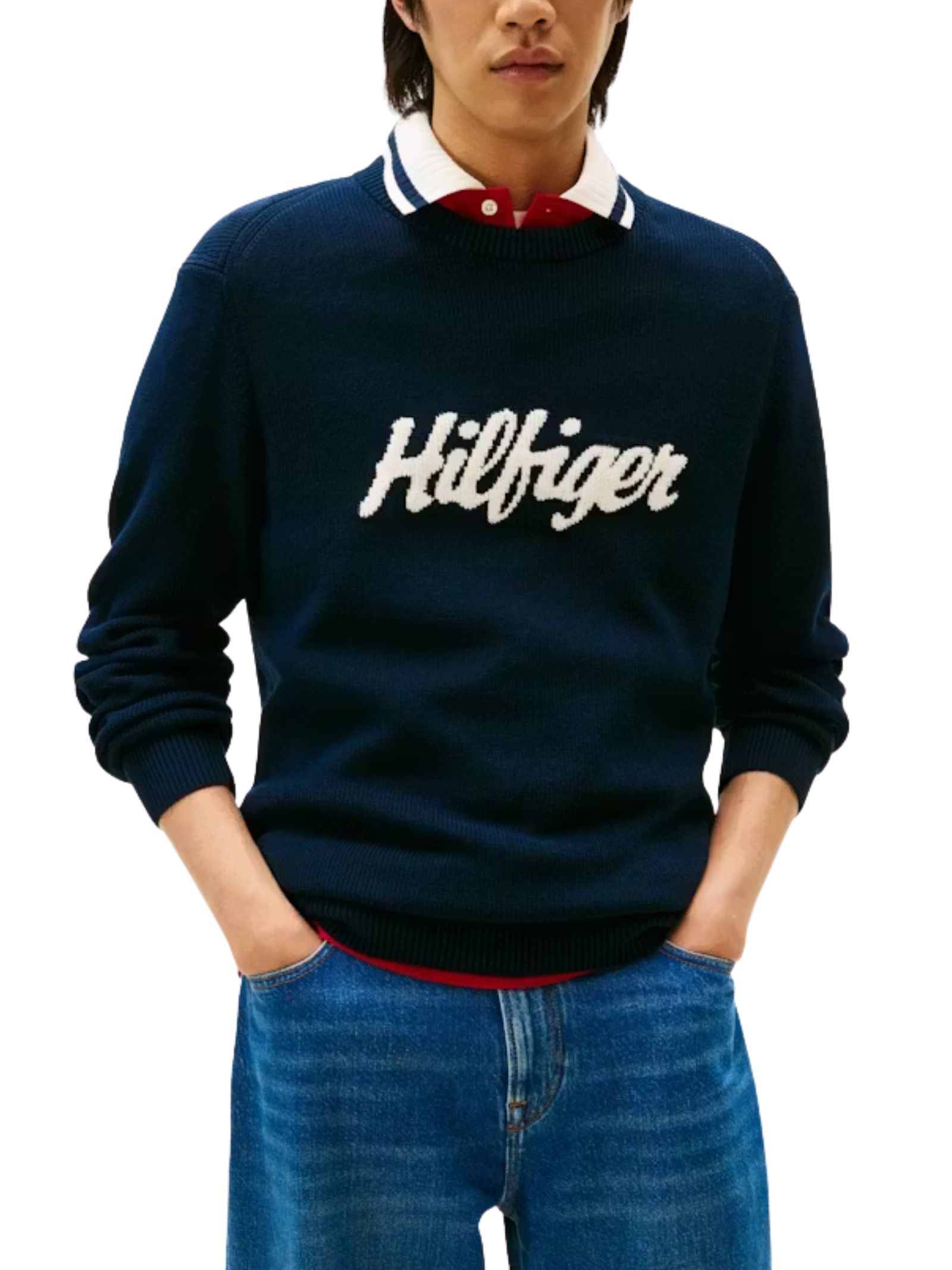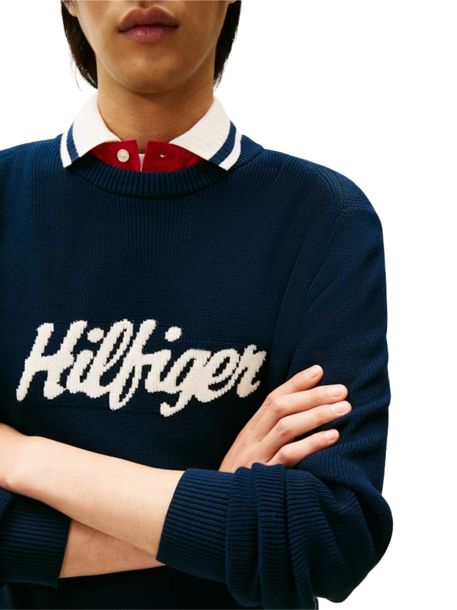 Maglione girocollo Tommy Hilfiger in puro cotone biologico dallo stile comodo ma raffinato, caratterizzato da una silhouette classica arricchita da dettagli decisi come la scritta Hilfiger in maglia jacquard sul petto, la scollatura a coste larghe, le finiture a coste e il logo con bandiera sul polsino, per un look versatile e disinvolto adatto a ogni occasione, con vestibilità regolare. Composizione: 100% cotone biologico.