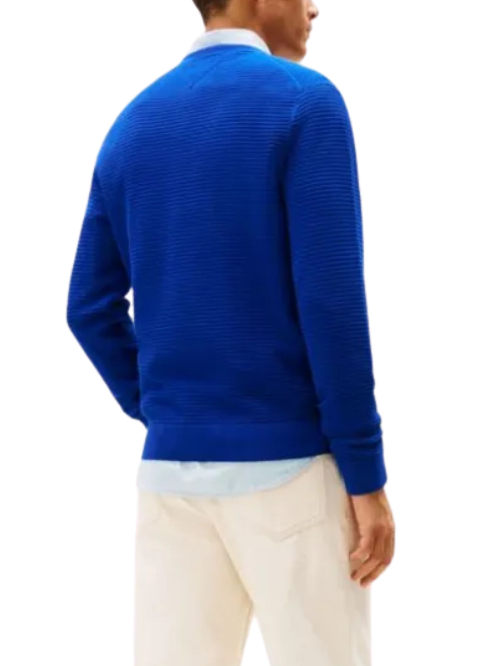 Maglioncino in puro cotone pettinato caratterizzato da lavorazione a maglia tramata, con girocollo, collo polsini e fondo a coste, nastro iconico allinterno del collo e bandierina ricamata sul petto, dalla vestibilità regular con spalle leggermente scese. Composizione: 100% cotone.