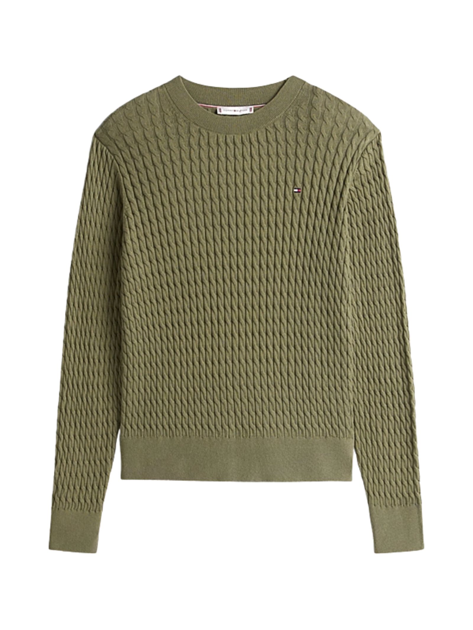 Pullover verde in maglia di puro cotone pettinato, leggero e intramontabile, perfetto per le mezze stagioni. Realizzato in maglia sottile con lavorazione intrecciata, presenta girocollo e bordi a contrasto, collo, polsini e fondo a coste, e nastro iconico allinterno del collo. Il branding Tommy Hilfiger è valorizzato dalla bandierina ricamata sul petto. Vestibilità regular; la modella è alta 176 cm e indossa la taglia S. Composizione: 100% cotone.