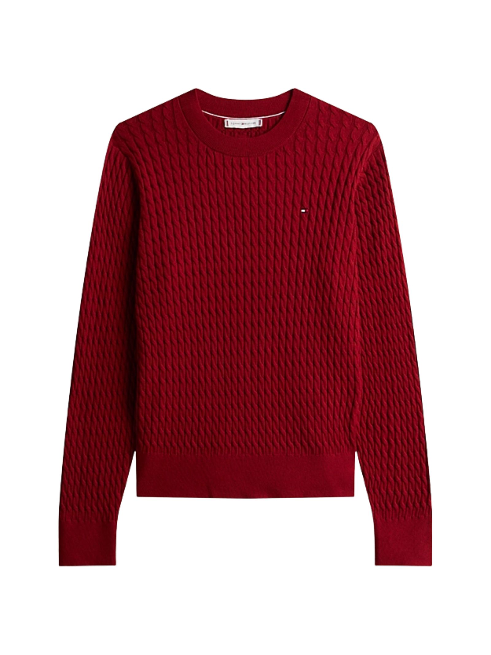 Pullover rosso in maglia di puro cotone pettinato, leggero e intramontabile, perfetto per le mezze stagioni. Realizzato in maglia sottile con lavorazione intrecciata, presenta girocollo e bordi a contrasto, collo, polsini e fondo a coste, e nastro iconico allinterno del collo. Il branding Tommy Hilfiger è valorizzato dalla bandierina ricamata sul petto. Vestibilità regular; la modella è alta 176 cm e indossa la taglia S. Composizione: 100% cotone.