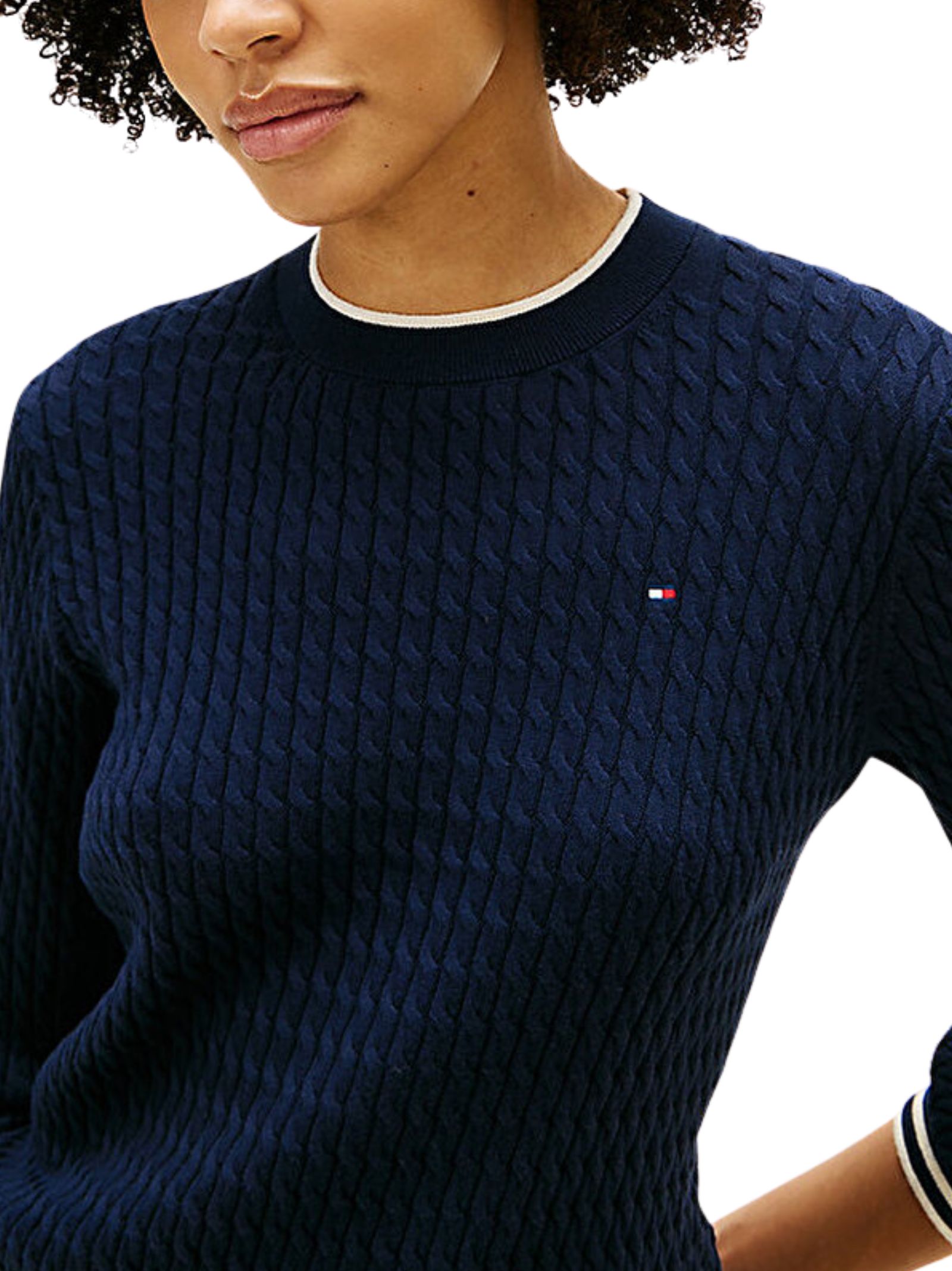 Maglione in puro cotone pettinato caratterizzato da design a trecce e silhouette a girocollo, leggero e confortevole da indossare a strati nelle mezze stagioni, con maglia fine, collo alto a contrasto, collo, polsini e orlo a coste con polsini a punta, nastro distintivo allinterno del colletto e branding Tommy Hilfiger con ricamo della bandiera sul petto, vestibilità regolare. Composizione: 100% cotone.