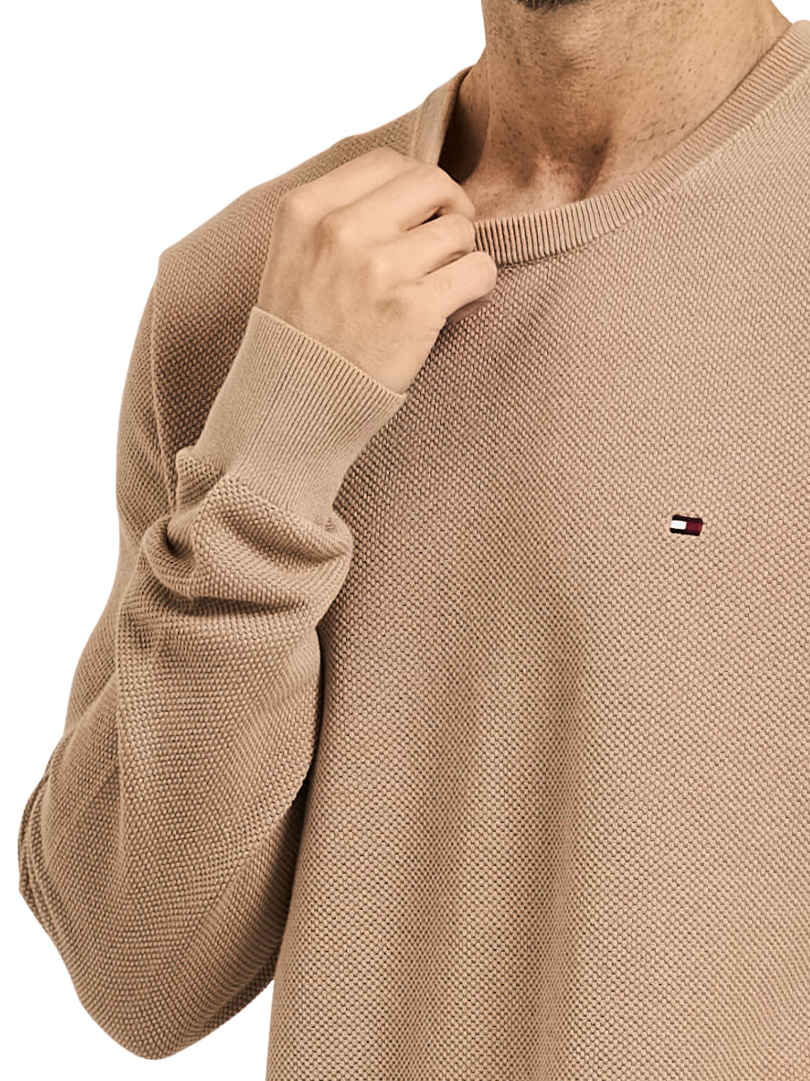 Pullover tortora in puro cotone pettinato con texture tramata, girocollo, collo, polsini e fondo a coste, nastro iconico interno al collo, branding e bandierina Tommy Hilfiger ricamata sul petto; vestibilità regular fit con spalle leggermente scese; 100% cotone.