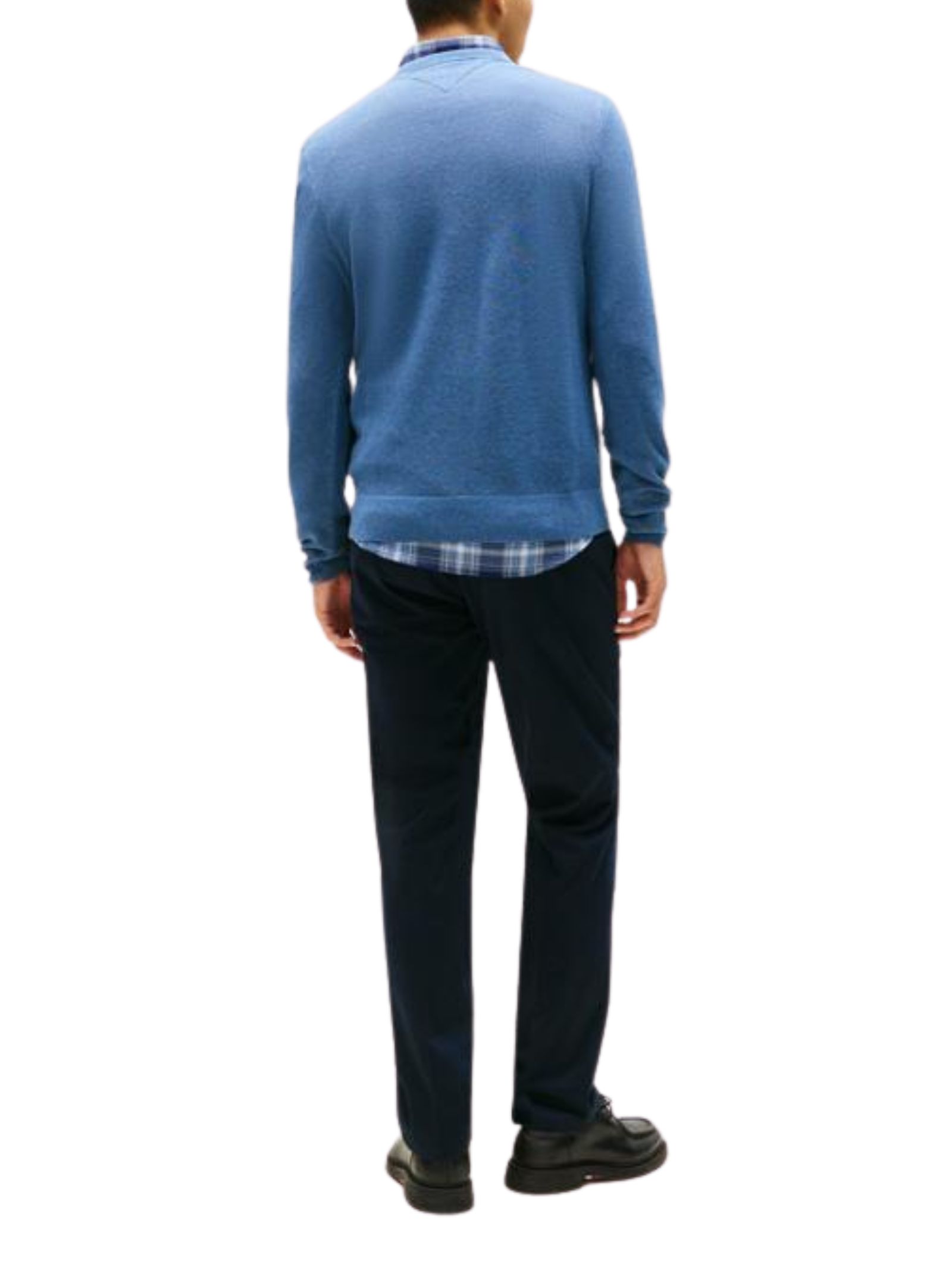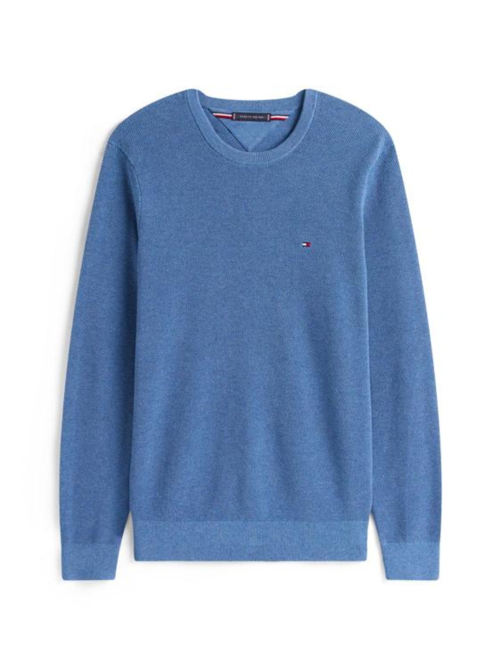 Pullover azzurro in puro cotone pettinato con texture tramata, girocollo, collo, polsini e fondo a coste, nastro iconico interno al collo, branding e bandierina Tommy Hilfiger ricamata sul petto; vestibilità regular fit con spalle leggermente scese; 100% cotone.