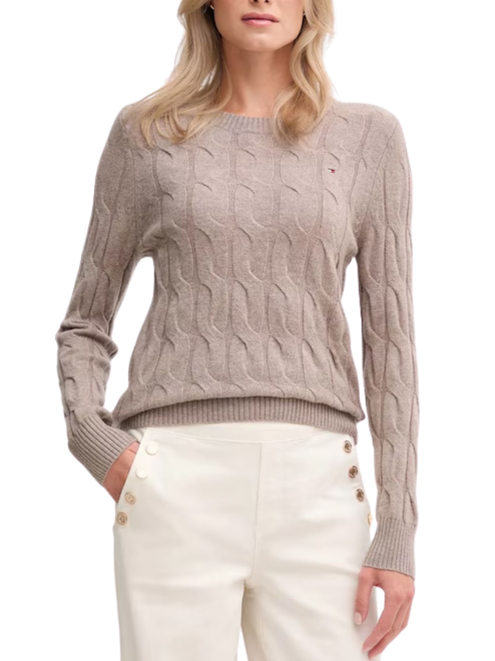 Pullover tortora in pura lana con classica lavorazione a maglia intrecciata, morbida reinterpretazione dello stile heritage. Realizzato al 100% in lana, presenta girocollo, collo, polsini e fondo a coste, oltre al nastro iconico allinterno del collo. Il branding Tommy Hilfiger è valorizzato dalla bandierina ricamata sul petto. Vestibilità regular; la modella è alta 176 cm e indossa la taglia S.