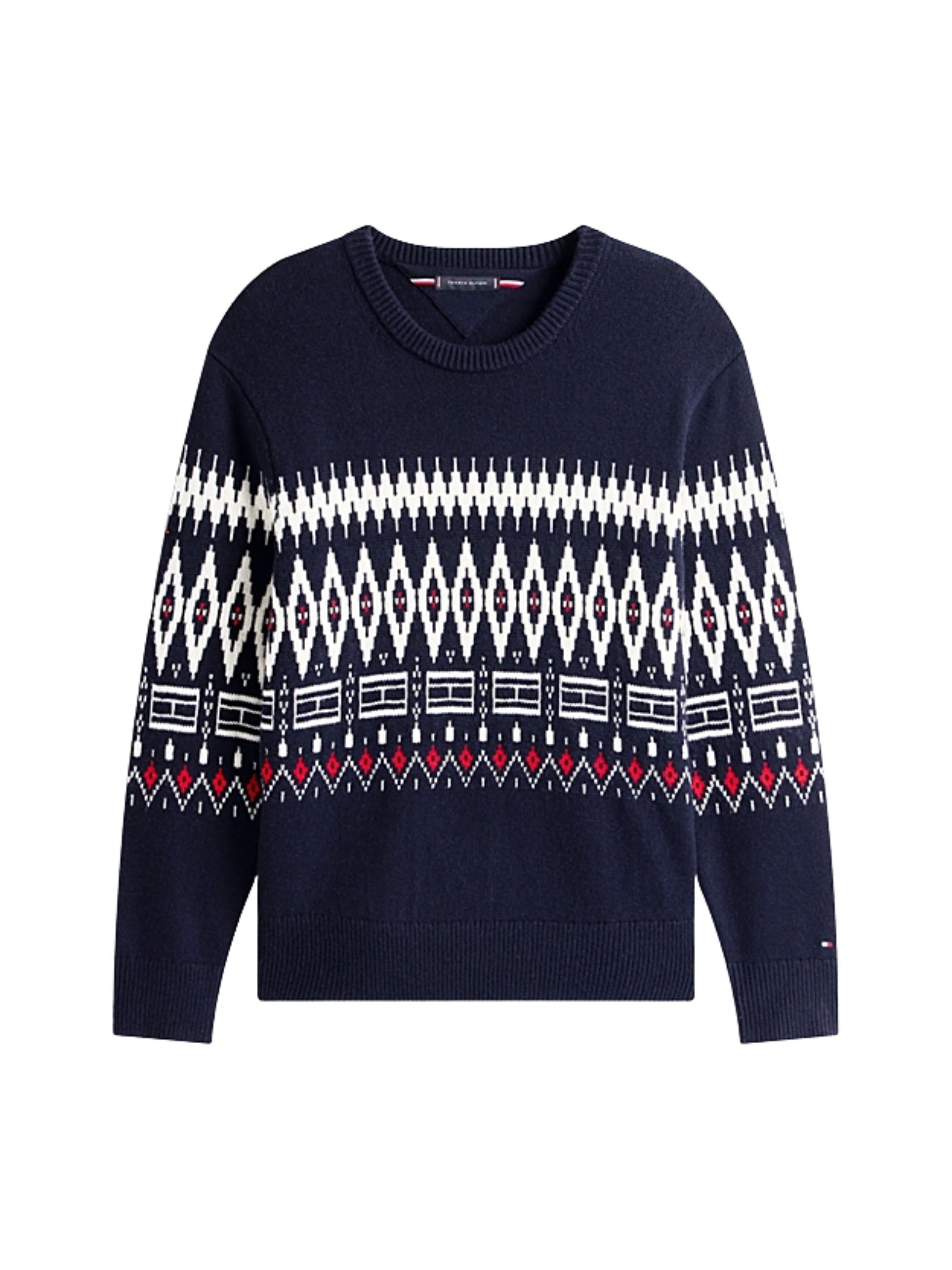 Pullover blu in misto lana dagnello con motivo Fair Isle reinterpretato, girocollo, collo, polsini e fondo a coste, logo bandierina Tommy Hilfiger nel motivo, branding Tommy Hilfiger; vestibilità relaxed fit con spalle scese; 70% lana dagnello, 30% nylon.