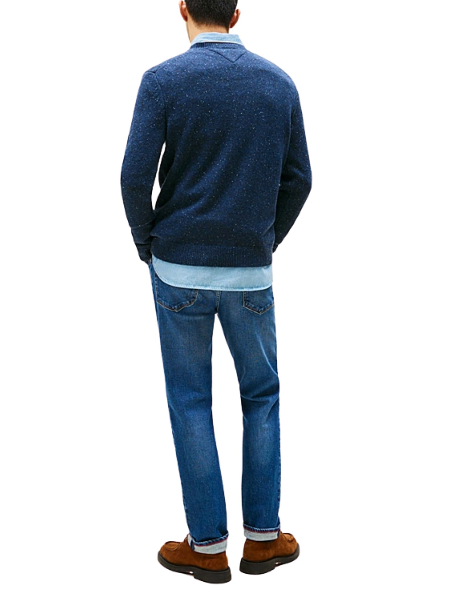Pullover blu in misto lana dagnello con lavorazione Donegal, girocollo, collo, polsini e fondo a coste, nastro iconico interno al collo, branding e bandierina Tommy Hilfiger ricamata sul petto; vestibilità regular fit con spalle leggermente scese; 70% lana dagnello, 30% nylon.