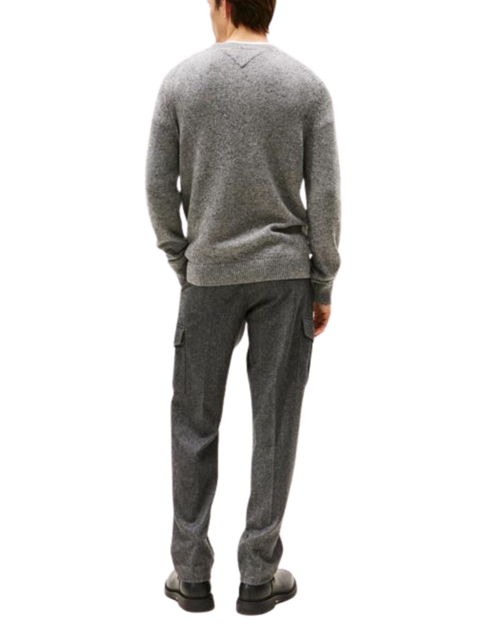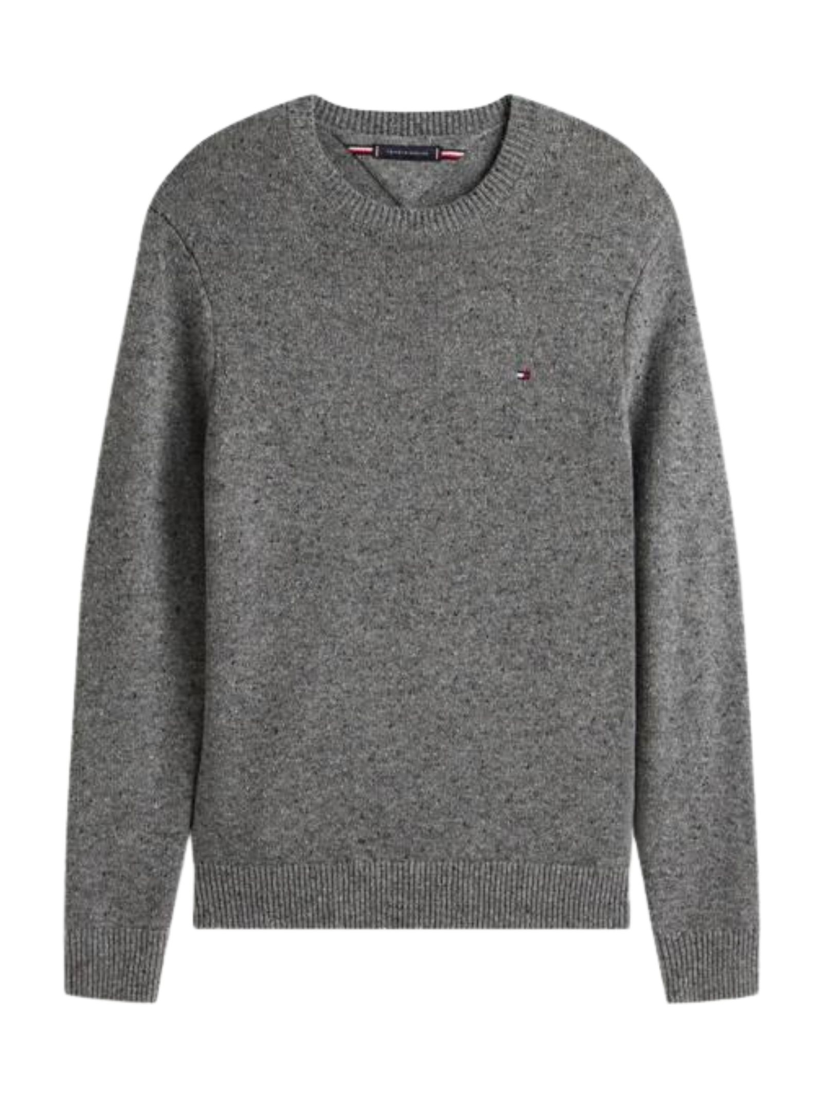 Pullover grigio in misto lana dagnello con lavorazione Donegal, girocollo, collo, polsini e fondo a coste, nastro iconico interno al collo, branding e bandierina Tommy Hilfiger ricamata sul petto; vestibilità regular fit con spalle leggermente scese; 70% lana dagnello, 30% nylon.