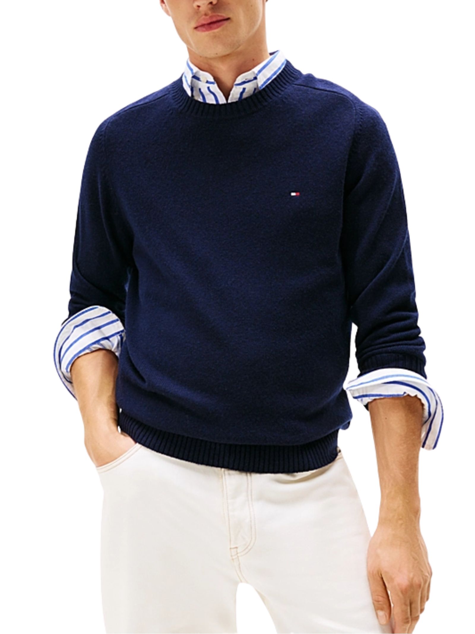 Pullover blu in pura lana di agnello con girocollo, collo, polsini e fondo a coste, nastro iconico interno al collo, branding e bandierina Tommy Hilfiger ricamata sul petto; vestibilità regular fit; 100% lana di agnello.