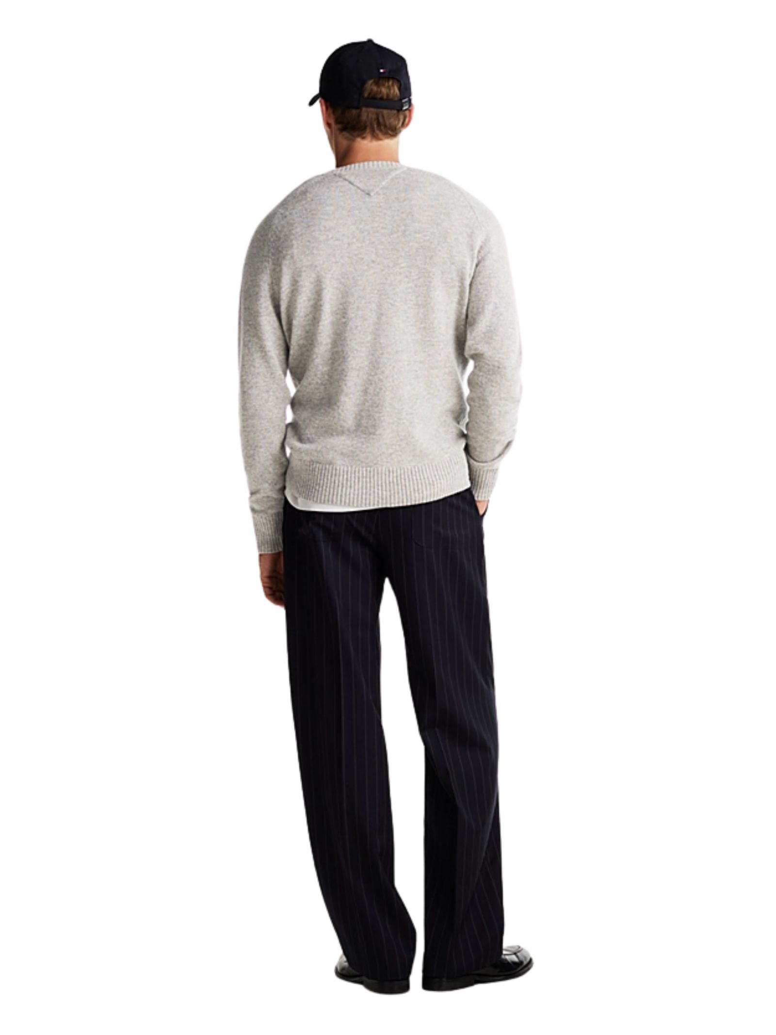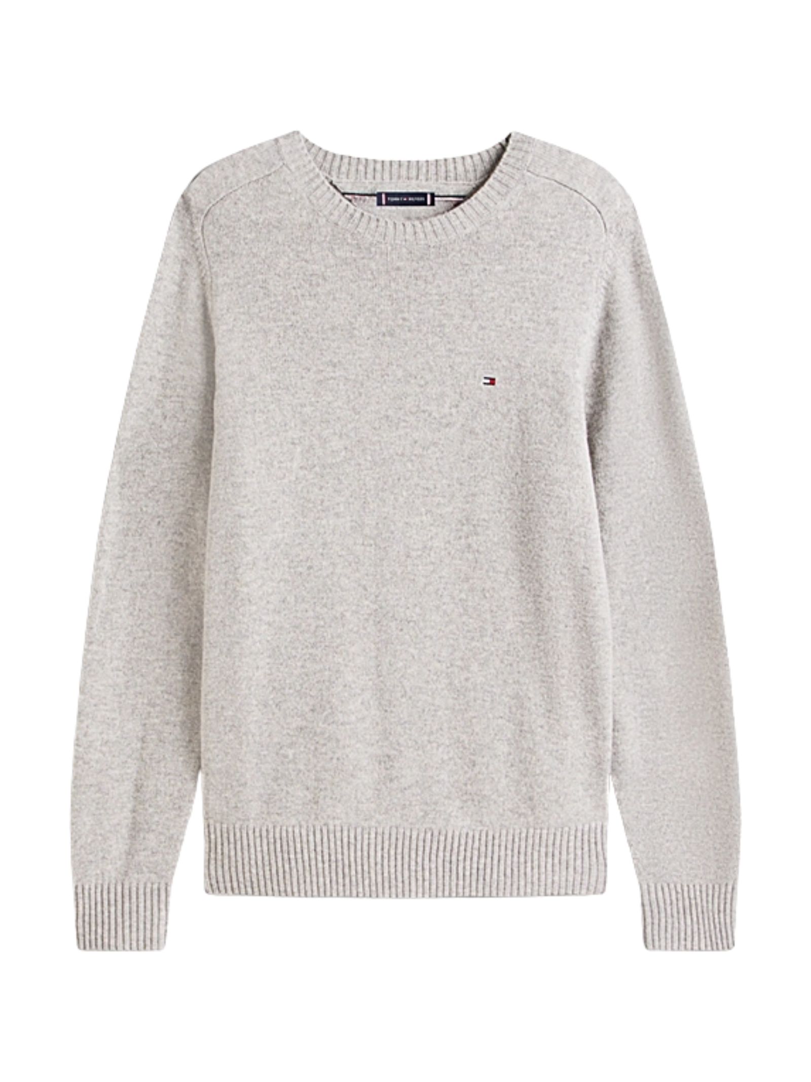 Pullover grigio chiaro in pura lana di agnello con girocollo, collo, polsini e fondo a coste, nastro iconico interno al collo, branding e bandierina Tommy Hilfiger ricamata sul petto; vestibilità regular fit; 100% lana di agnello.