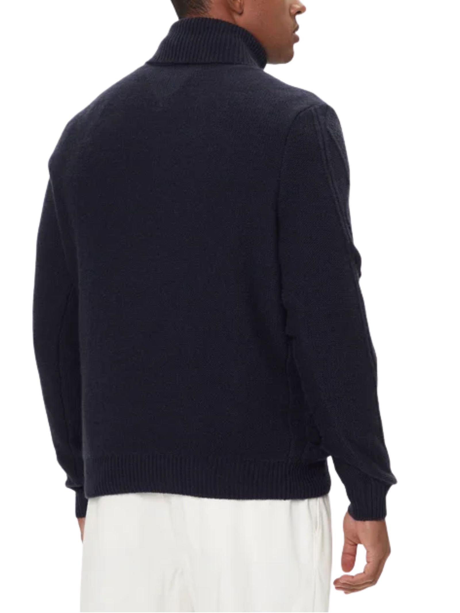 Dolcevita blu in misto lana e cashmere con lavorazione a maglia intrecciata, collo dolcevita, collo, polsini e fondo a coste, branding Tommy Hilfiger e placchetta con bandierina sulla manica; vestibilità relaxed fit con spalle leggermente scese; 90% lana, 10% cashmere.