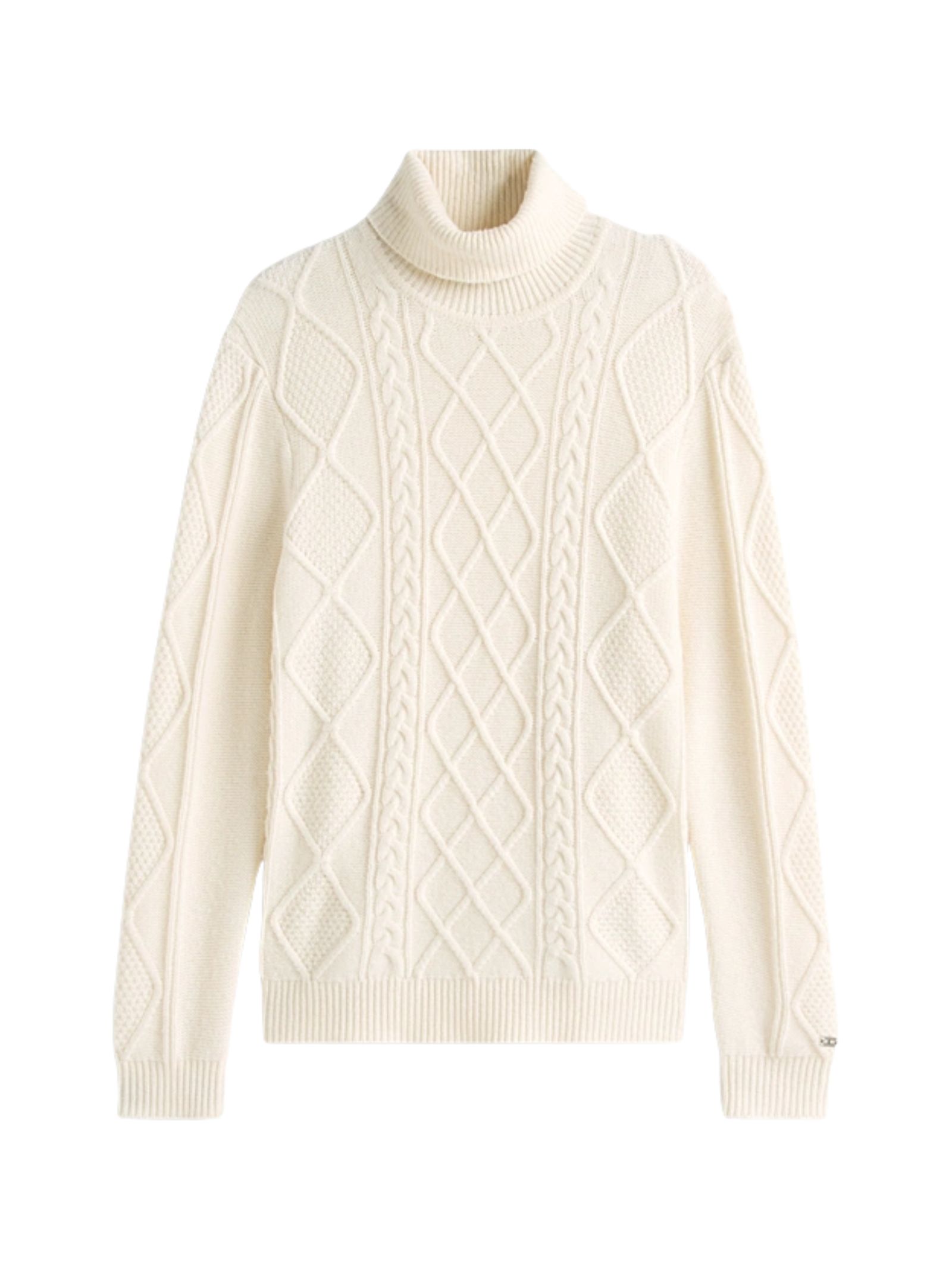 Dolcevita avorio in misto lana e cashmere con lavorazione a maglia intrecciata, collo dolcevita, collo, polsini e fondo a coste, branding Tommy Hilfiger e placchetta con bandierina sulla manica; vestibilità relaxed fit con spalle leggermente scese; 90% lana, 10% cashmere.