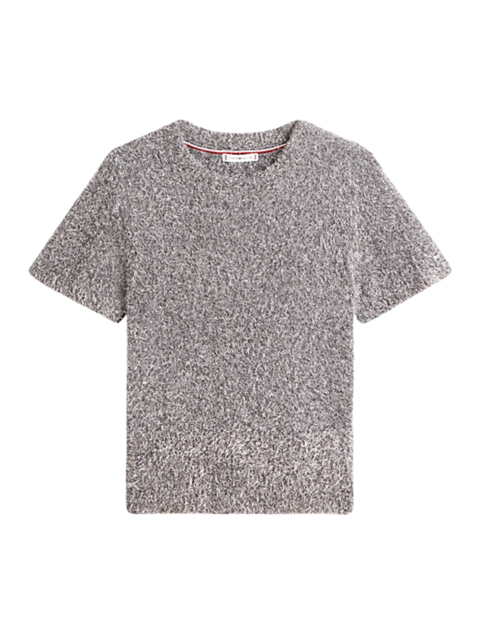 Pullover grigio a maniche corte Tommy Hilfiger realizzato in maglia di misto lana e cashmere, impreziosito da luccicanti fili metallizzati. Presenta girocollo, nastro iconico allinterno del collo, logo Tommy Hilfiger in corsivo ricamato sul retro del collo, branding distintivo e bandierina in metallo sulla manica. Vestibilità regular con maniche corte. Composizione: 34% poliestere, 19% nylon, 16% viscosa, 16% lana, 12% filo metallizzato, 3% cashmere.