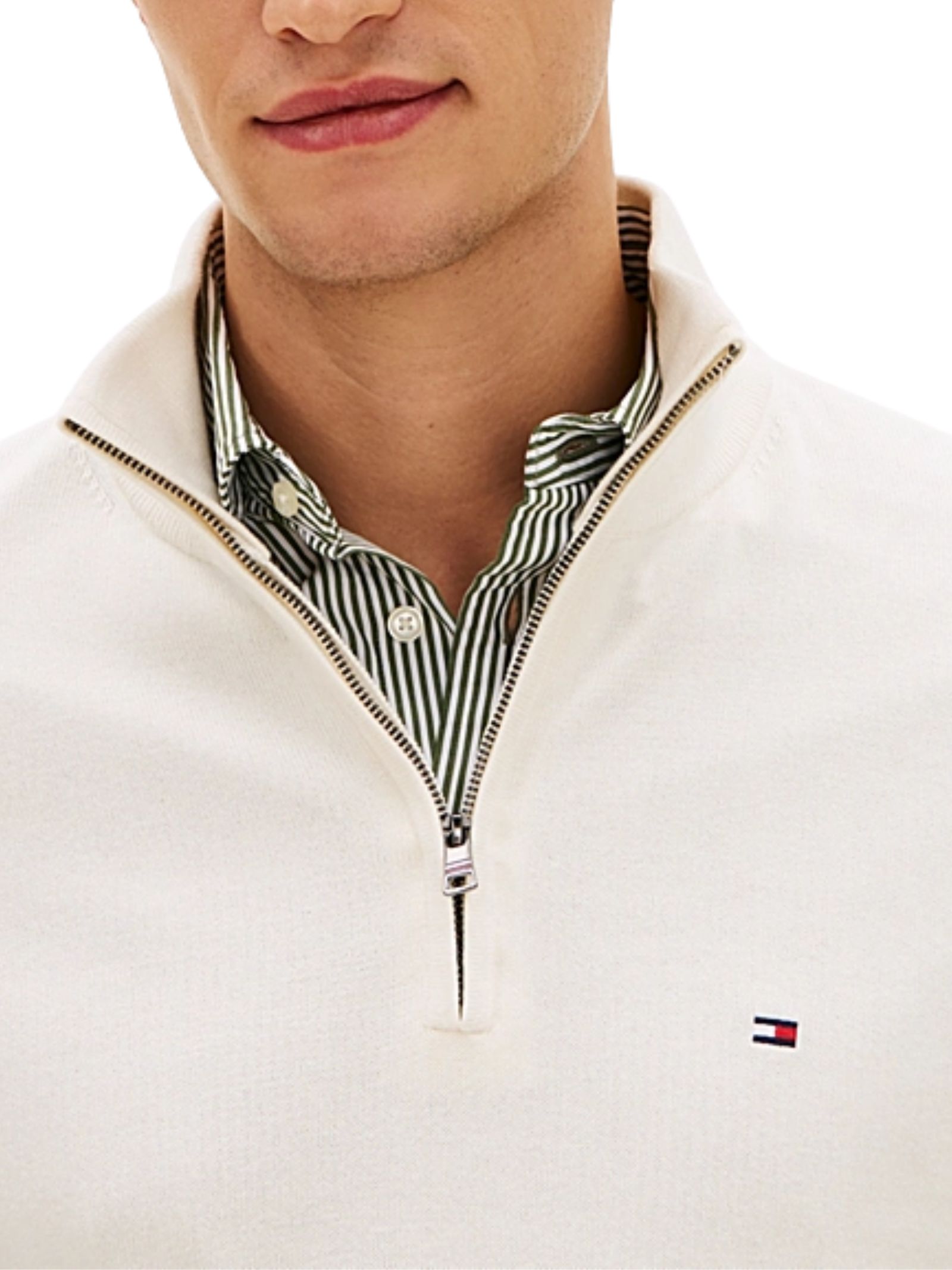 Maglioncino a lupetto in puro cotone pettinato con pratica chiusura a mezza zip, rifinito da collo polsini e fondo a coste, nastro iconico allinterno del collo, branding Tommy Hilfiger e bandierina ricamata sul petto, dalla vestibilità regular con spalle scese per uno stile casual raffinato. Composizione: 100% cotone.