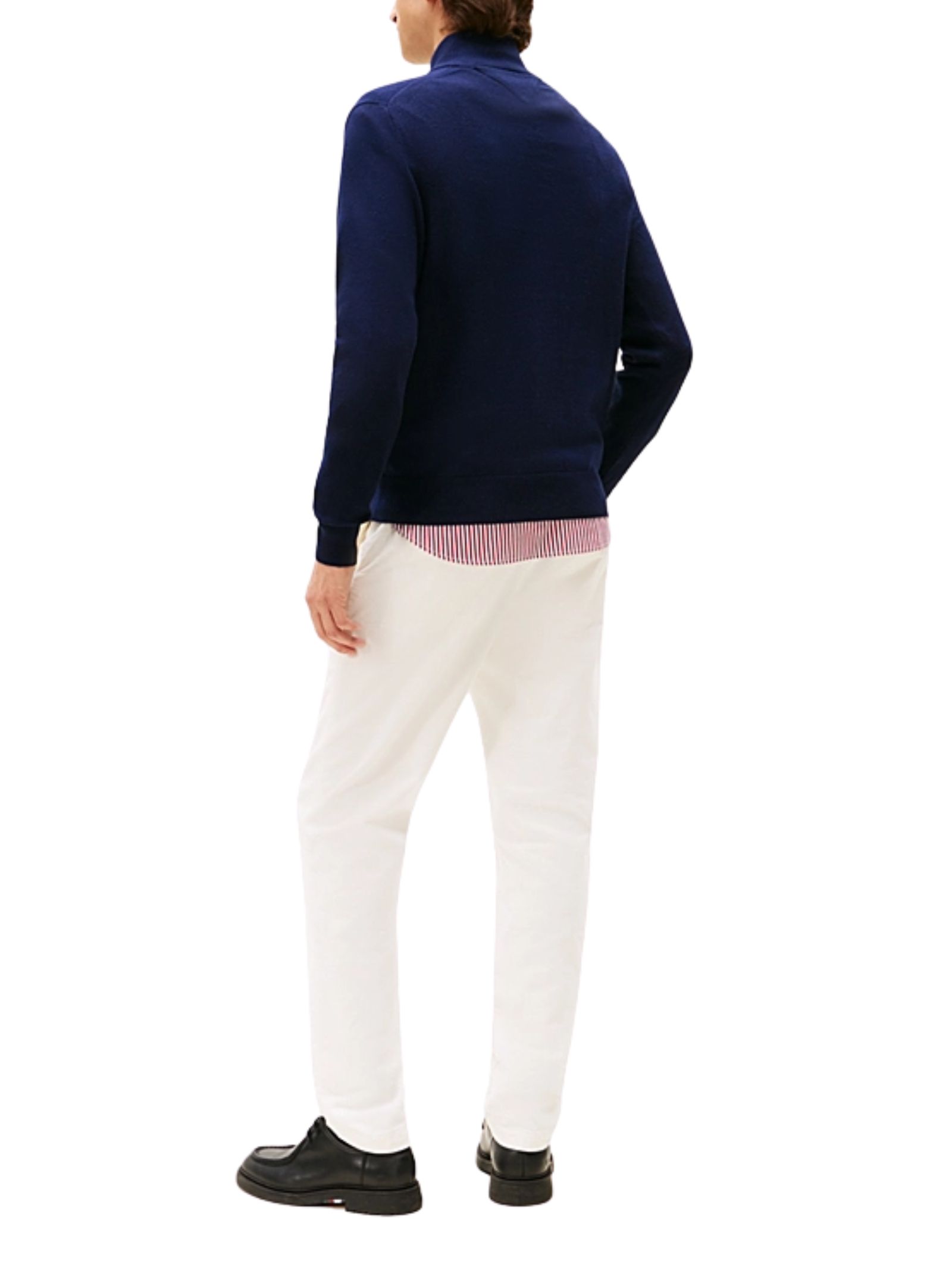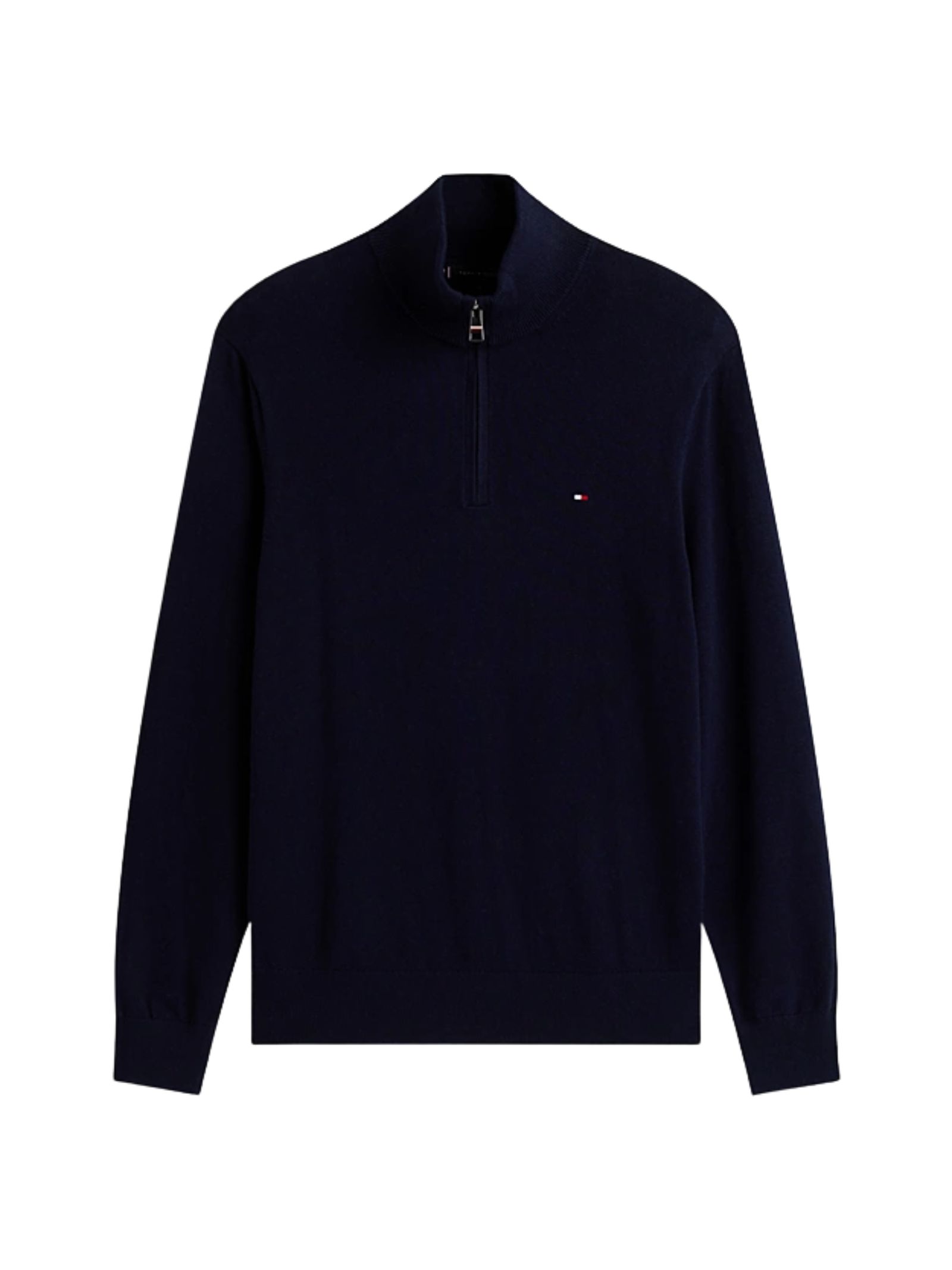 Pullover blu regular fit con mezza zip e bandierina ricamata, realizzato in pregiato cotone pima con una punta di cashmere per garantire calore e comfort. Presenta collo, polsini e fondo a coste e dettaglio iconico sul tiretto della zip. Composizione: 95% cotone, 5% cashmere.