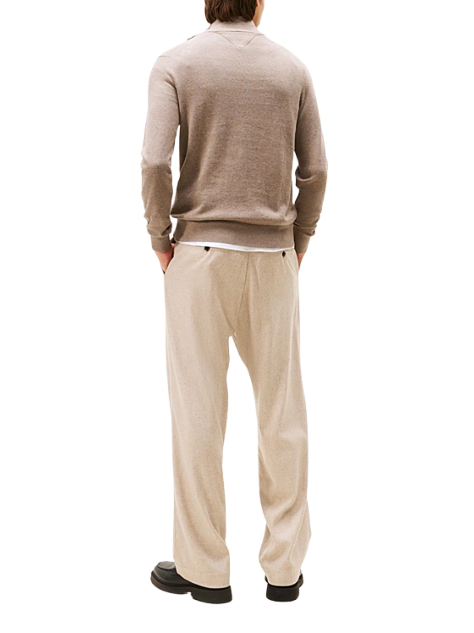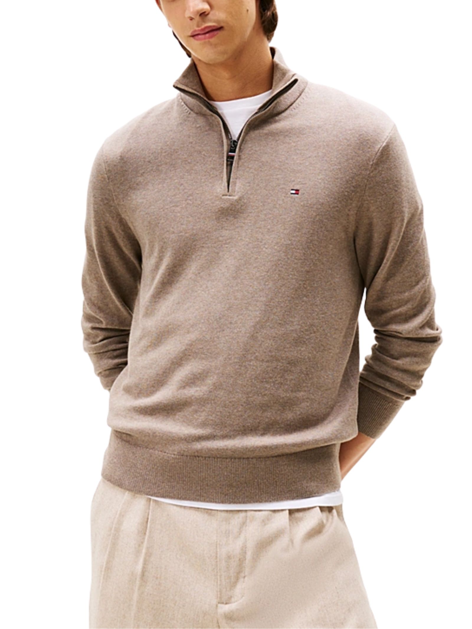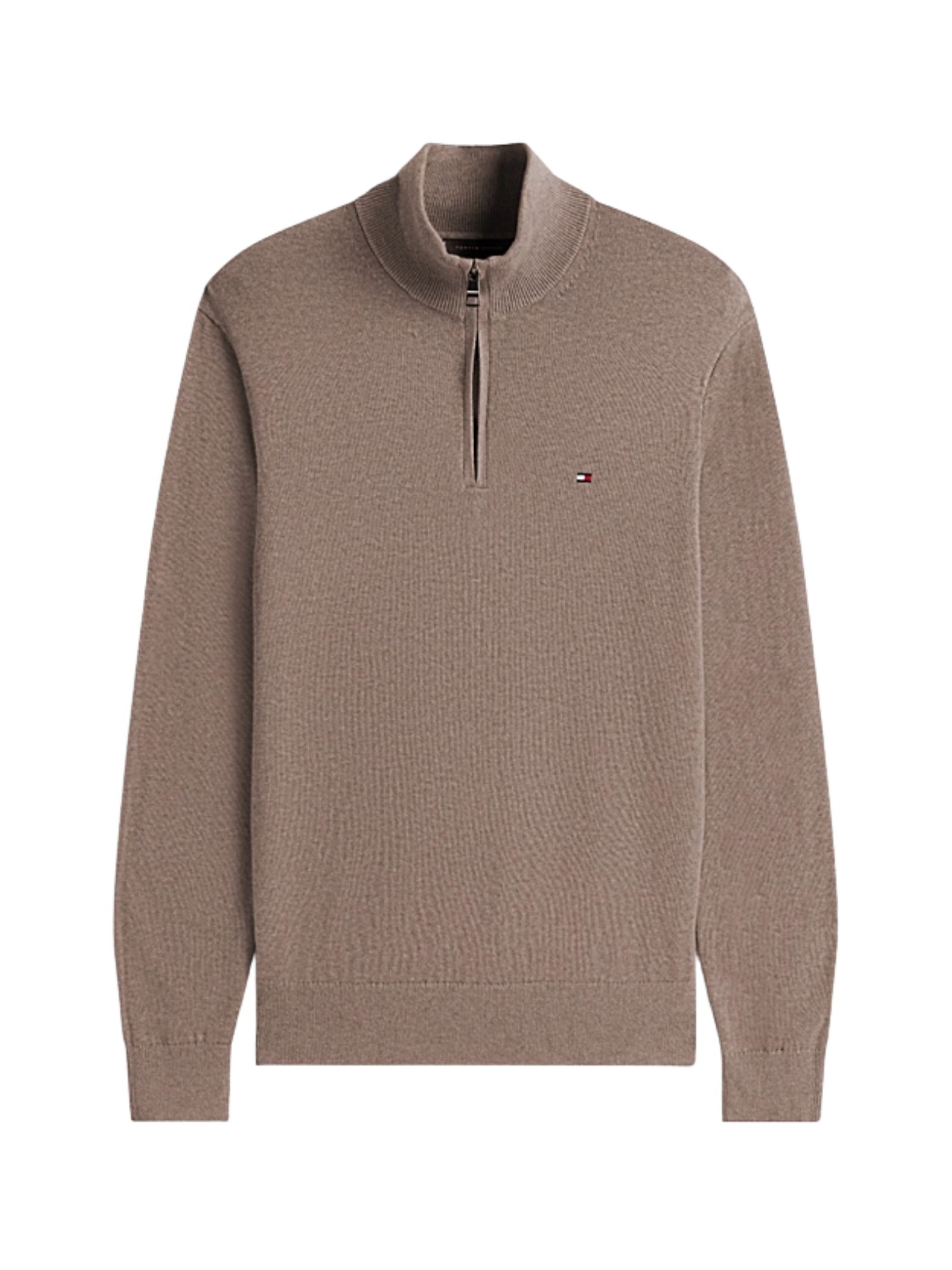 Pullover tortora regular fit con mezza zip e bandierina ricamata, realizzato in pregiato cotone pima con una punta di cashmere per garantire calore e comfort. Presenta collo, polsini e fondo a coste e dettaglio iconico sul tiretto della zip. Composizione: 95% cotone, 5% cashmere.