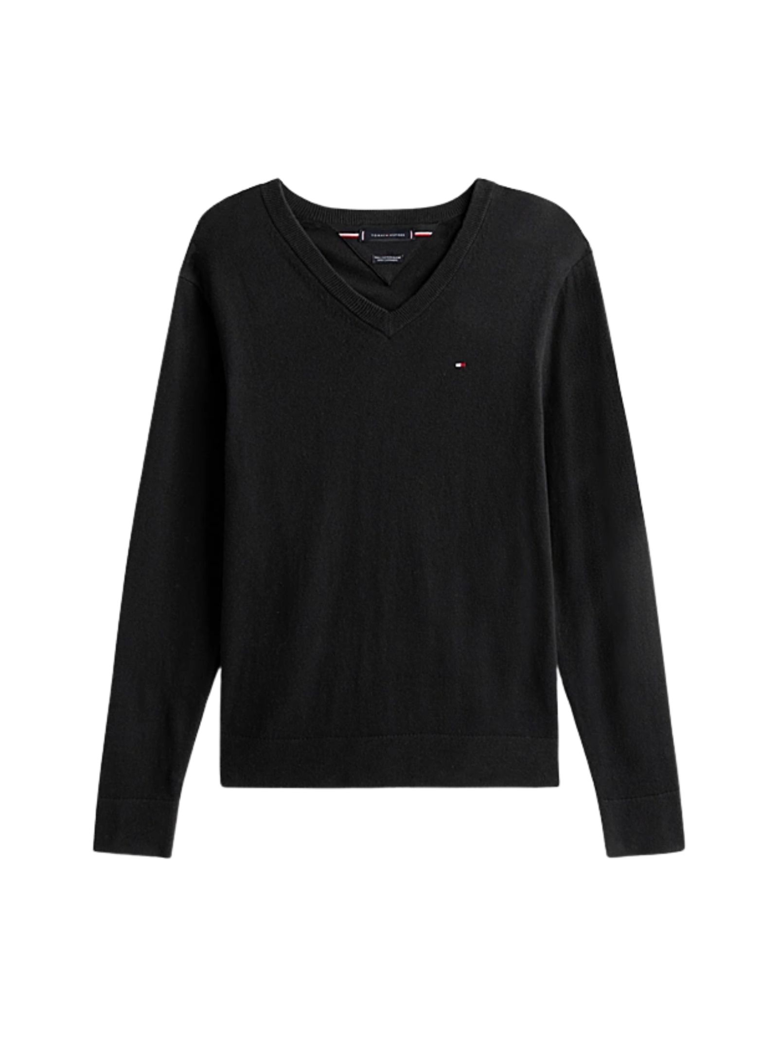 Pullover nero in caldo misto cotone pima e cashmere che aggiunge una nota di lusso agli outfit a strati, con scollatura a V, collo, polsini e fondo a coste, e nastro iconico allinterno del collo. Vestibilità regular fit. Composizione: 92% cotone, 8% cashmere.
