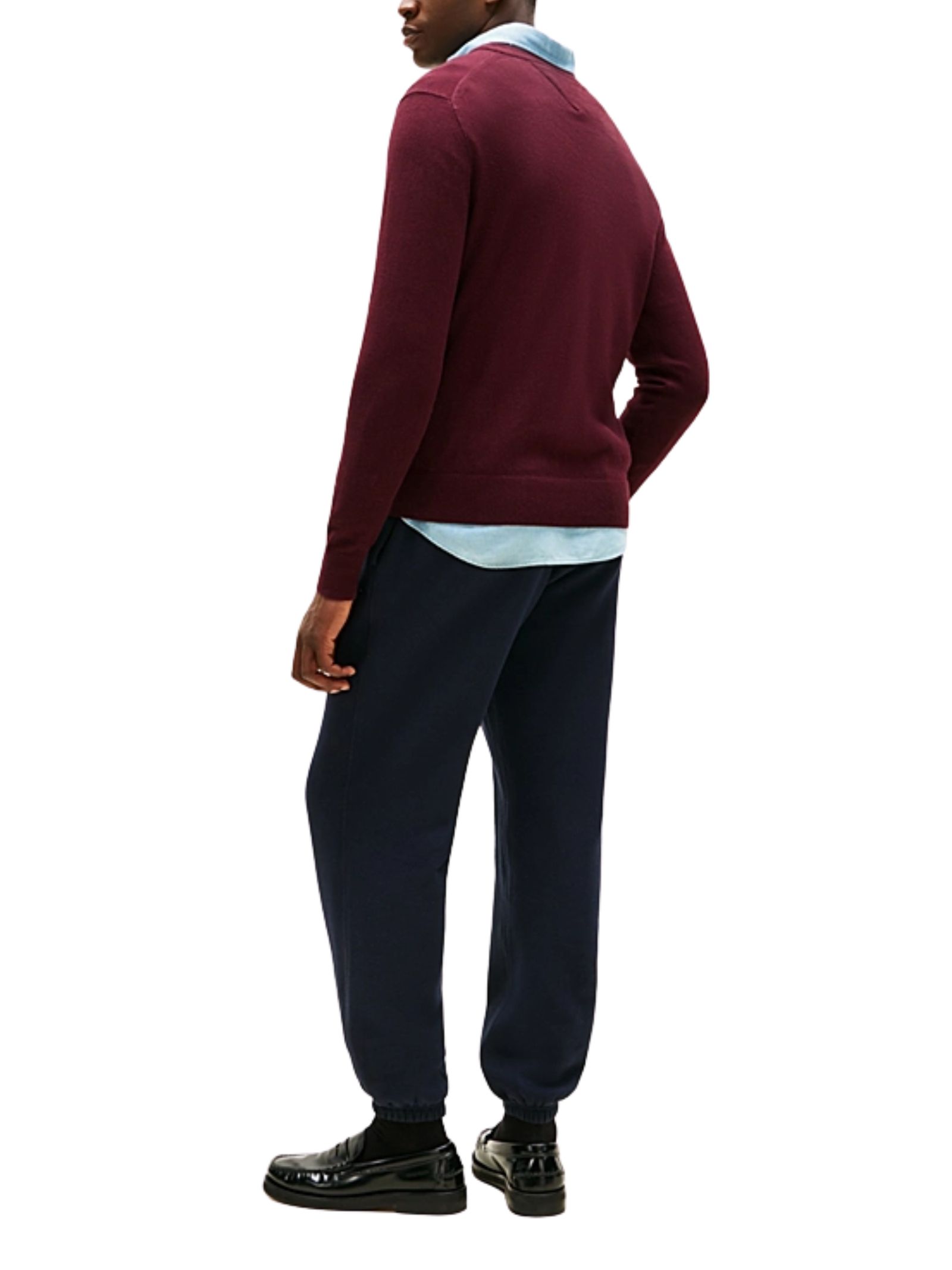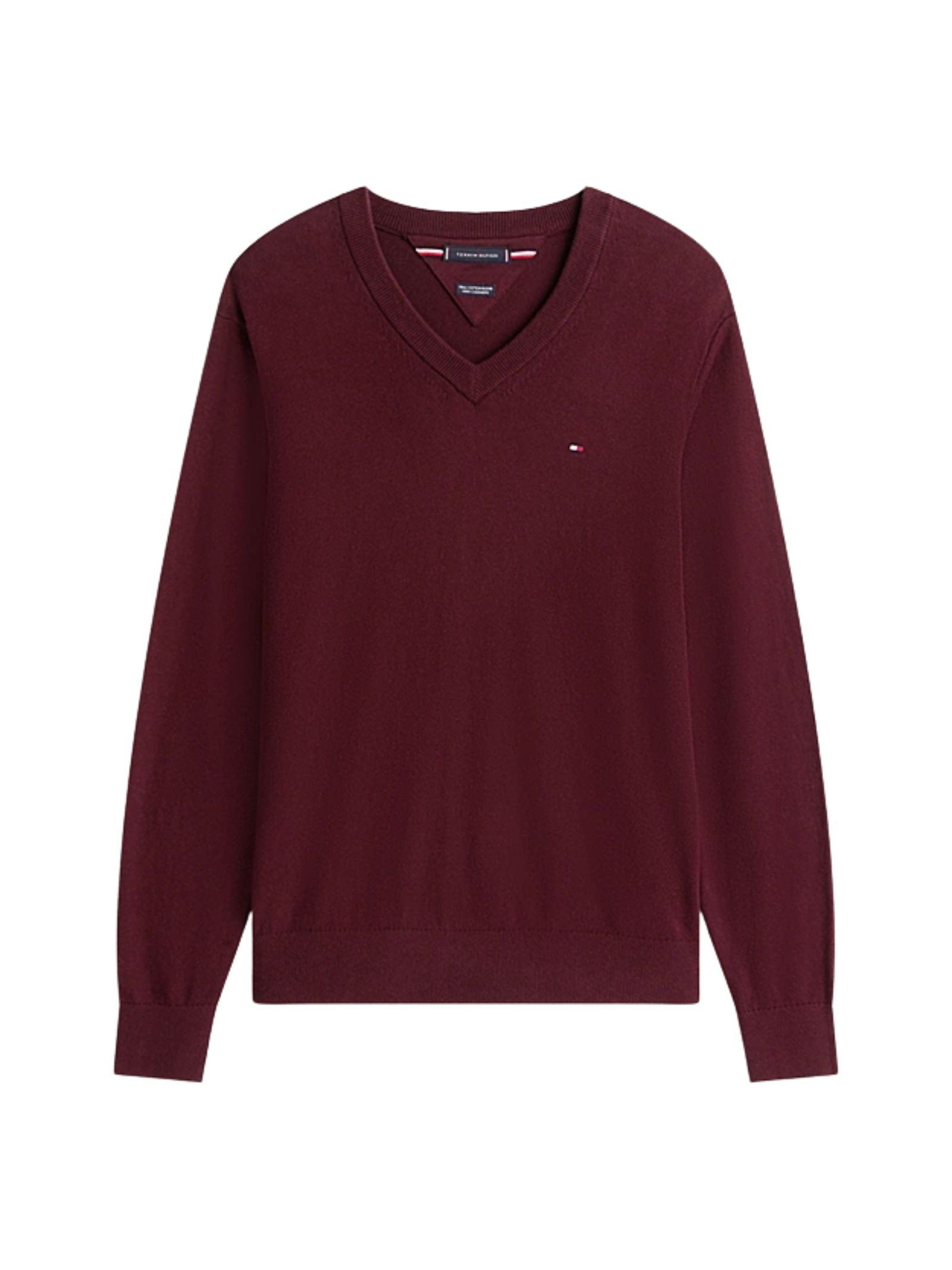 Pullover bordeaux in caldo misto cotone pima e cashmere che aggiunge una nota di lusso agli outfit a strati, con scollatura a V, collo, polsini e fondo a coste, e nastro iconico allinterno del collo. Vestibilità regular fit. Composizione: 92% cotone, 8% cashmere.