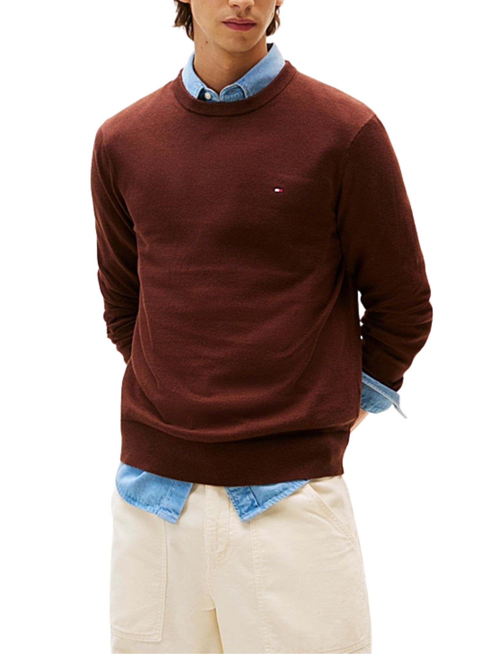 Pullover marrone a maniche lunghe in pregiato mix di cotone pima e cashmere, con girocollo e finiture a coste su collo, polsini e fondo, arricchito dal nastro iconico allinterno del collo e dalla bandierina Tommy Hilfiger ricamata sul petto. Vestibilità regular fit. Composizione: 92% cotone, 8% cashmere.