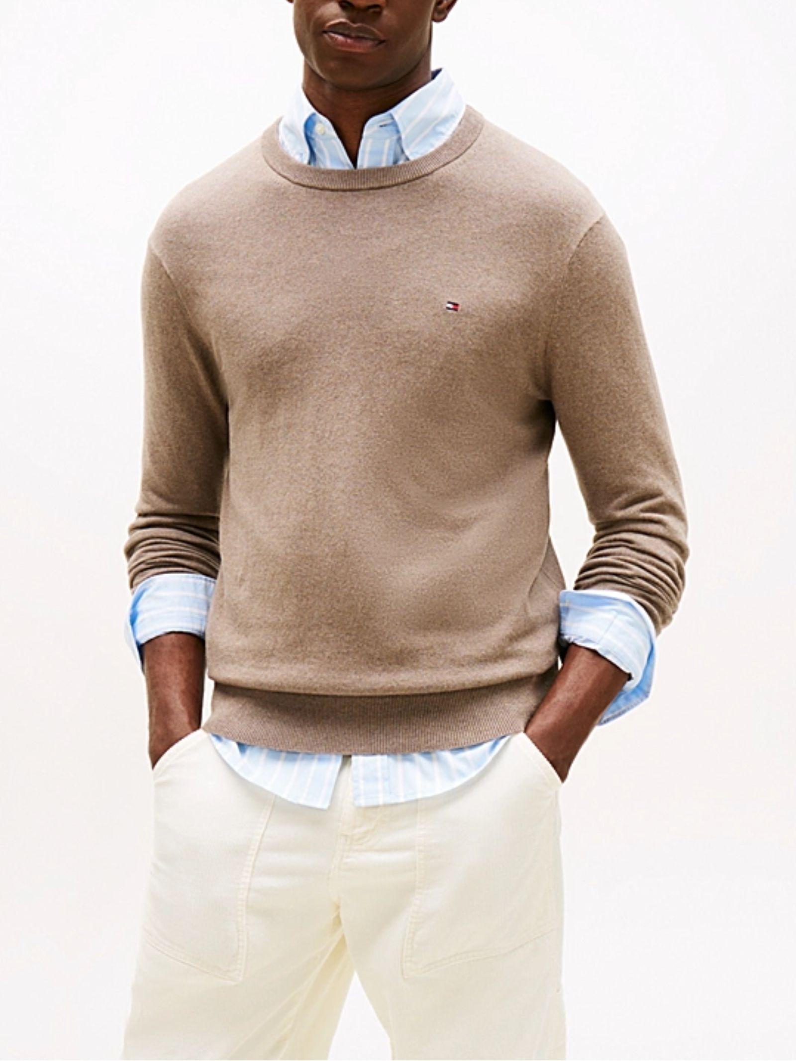 Pullover tortora a maniche lunghe in pregiato mix di cotone pima e cashmere, con girocollo e finiture a coste su collo, polsini e fondo, arricchito dal nastro iconico allinterno del collo e dalla bandierina Tommy Hilfiger ricamata sul petto. Vestibilità regular fit. Composizione: 92% cotone, 8% cashmere.