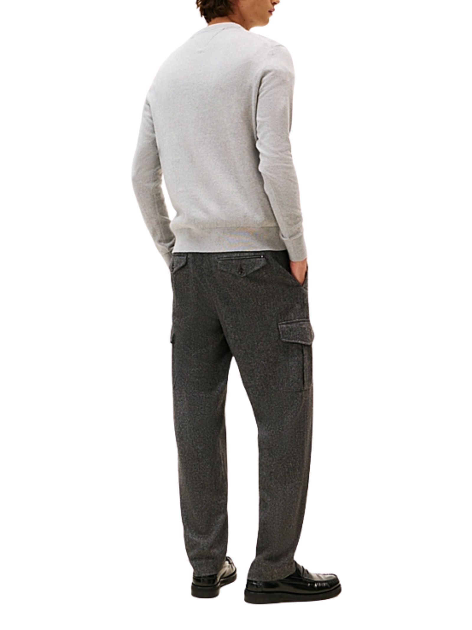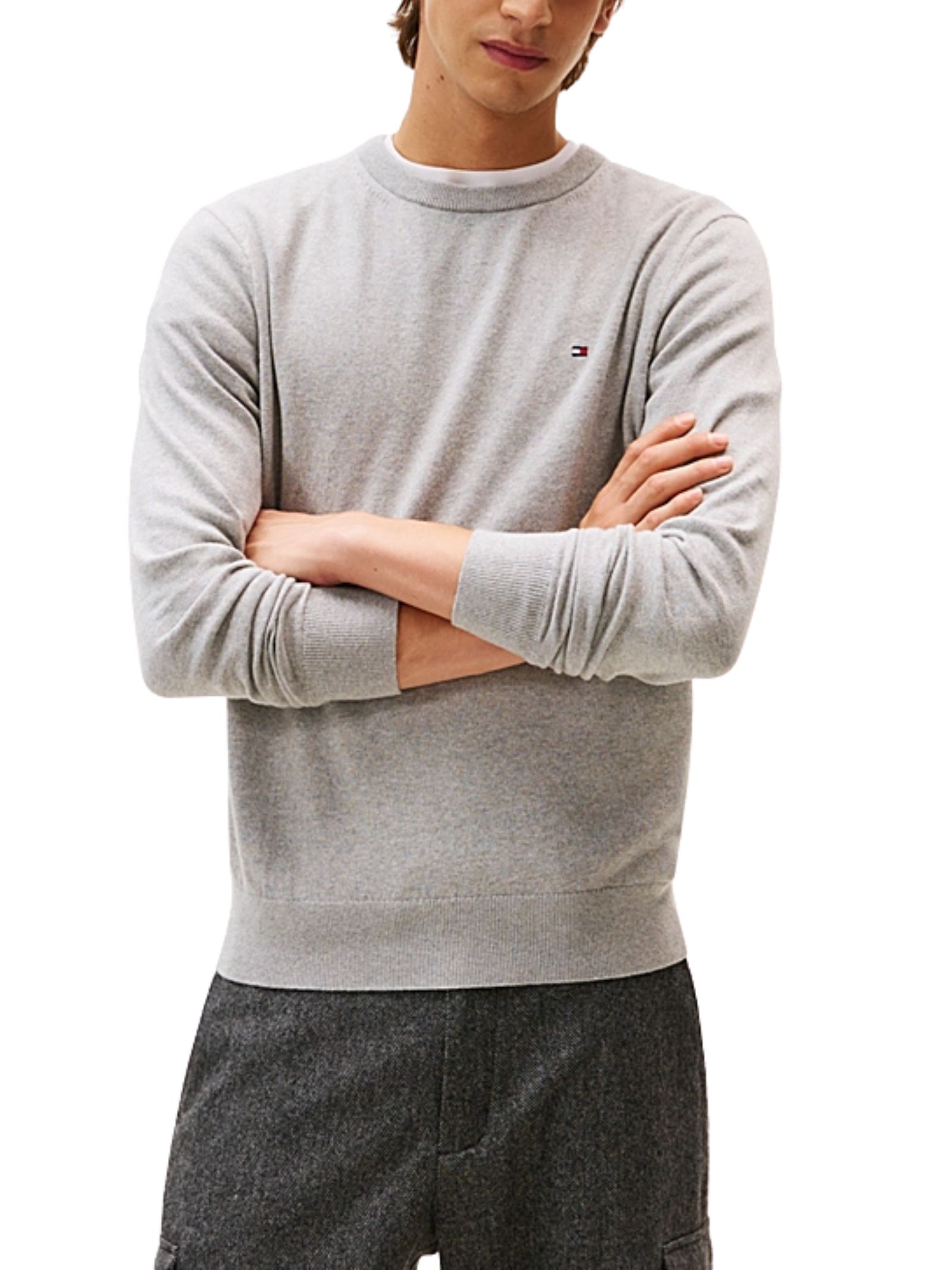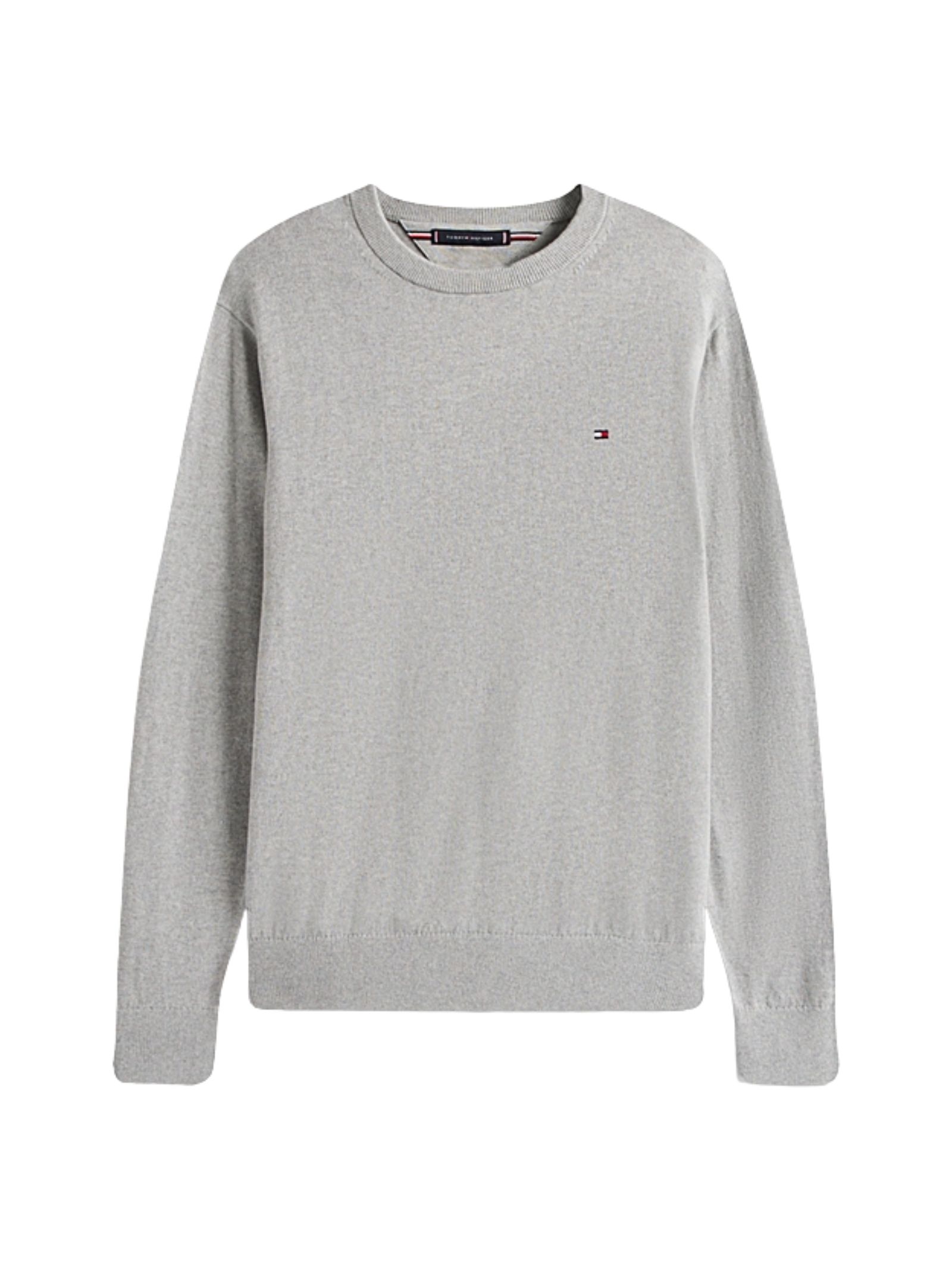 Pullover grigio chiaro a maniche lunghe in pregiato mix di cotone pima e cashmere, con girocollo e finiture a coste su collo, polsini e fondo, arricchito dal nastro iconico allinterno del collo e dalla bandierina Tommy Hilfiger ricamata sul petto. Vestibilità regular fit. Composizione: 92% cotone, 8% cashmere.