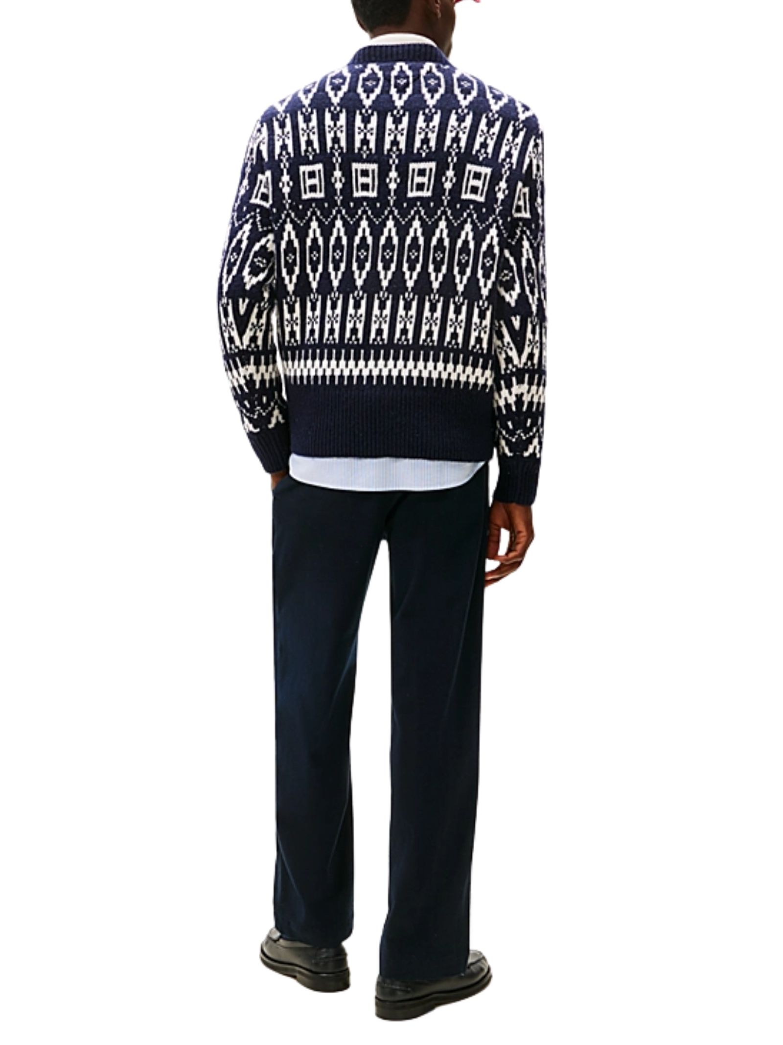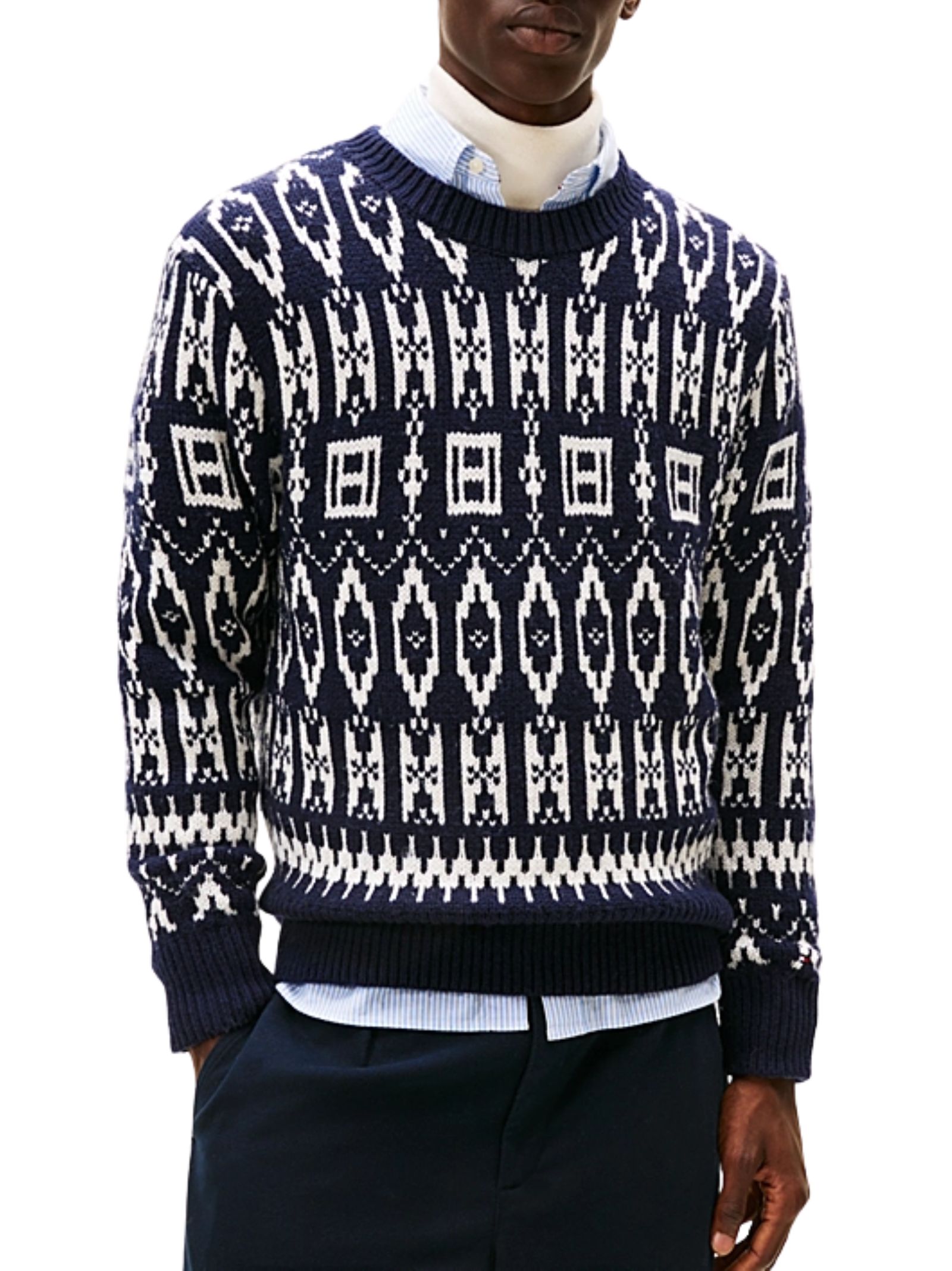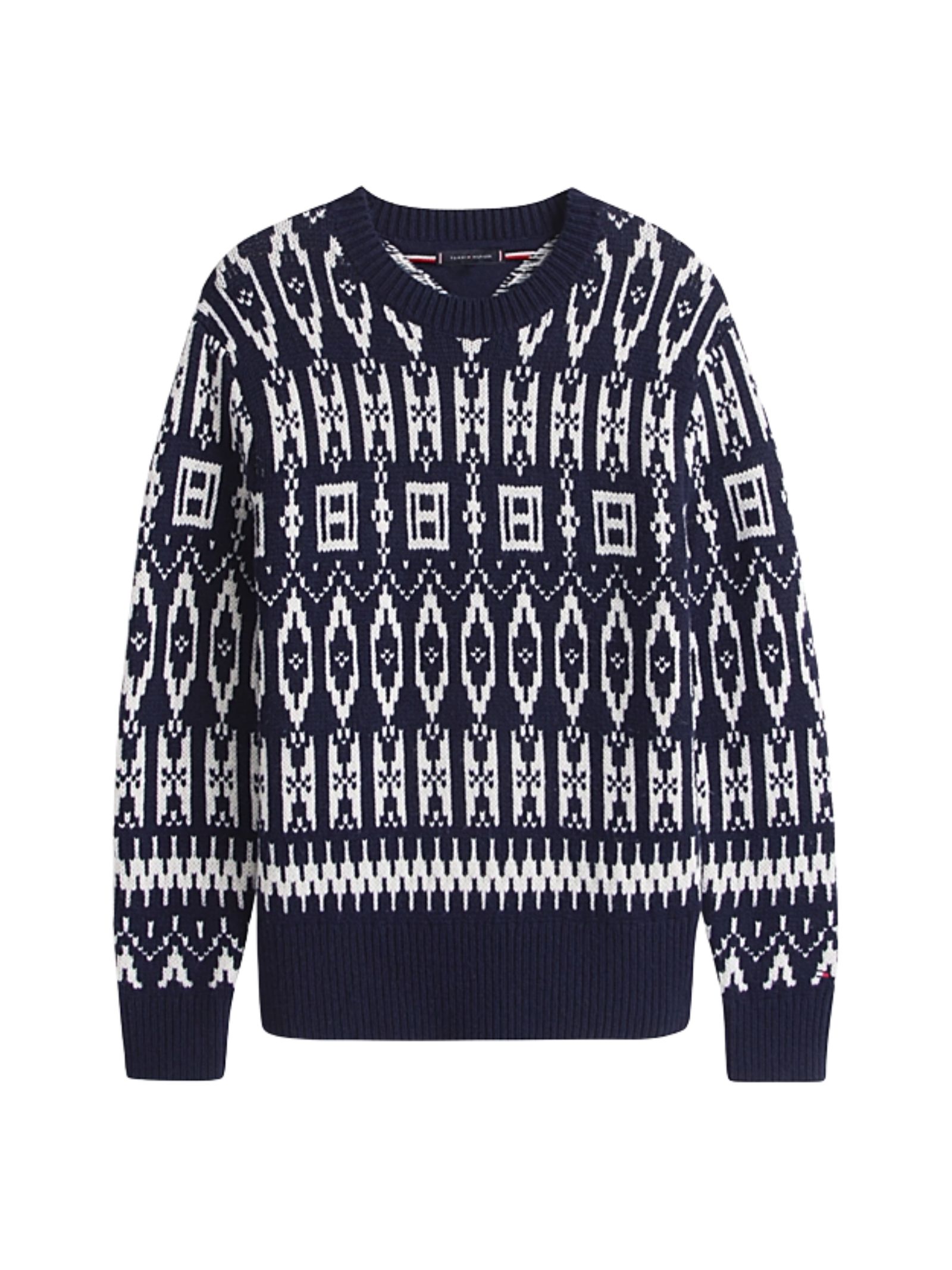 Pullover in misto lana dagnello con motivo Fair Isle, girocollo, collo, polsini e fondo a coste, logo bandierina Tommy Hilfiger nel motivo e branding Tommy Hilfiger; vestibilità relaxed fit con spalle scese; 70% lana dagnello, 30% nylon.