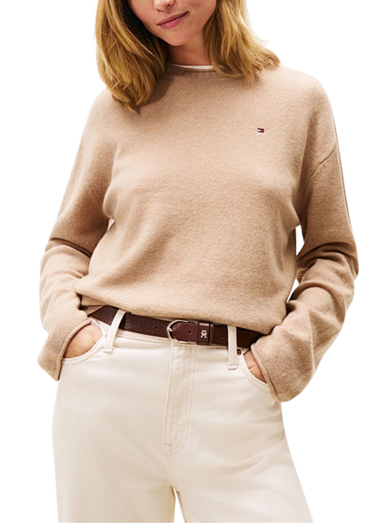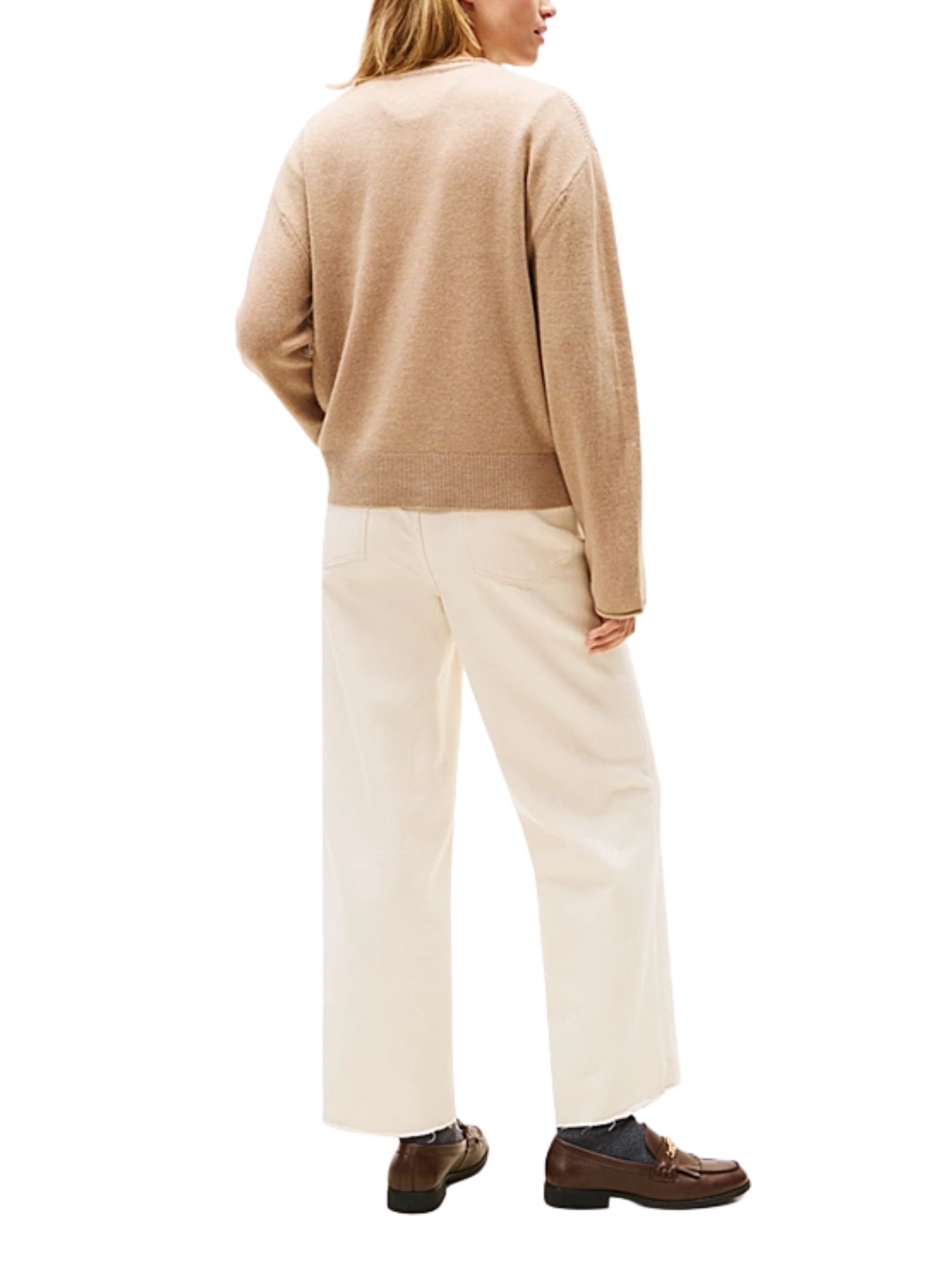 Pullover beige casual in morbida pura lana con spalle scese e taglio comodo, ideale per le giornate più fresche. Realizzato al 100% in lana, presenta girocollo, collo e polsini arrotolati, fondo in maglia a coste e nastro iconico allinterno del collo. Il branding Tommy Hilfiger è valorizzato dalla bandierina ricamata sul petto. Vestibilità relaxed con spalle scese.