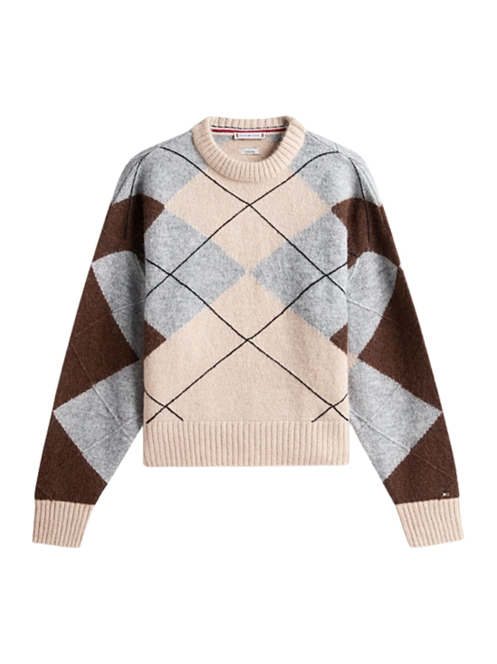 Pullover oversize Tommy Hilfiger in misto alpaca con motivo a rombi all over, caldo e confortevole, ideale per le giornate più fredde. Presenta girocollo, collo, polsini e fondo a coste, nastro iconico allinterno del collo, branding Tommy Hilfiger e bandierina in metallo sulla manica. Vestibilità oversize con spalle scese. Composizione: 50% alpaca, 50% nylon.