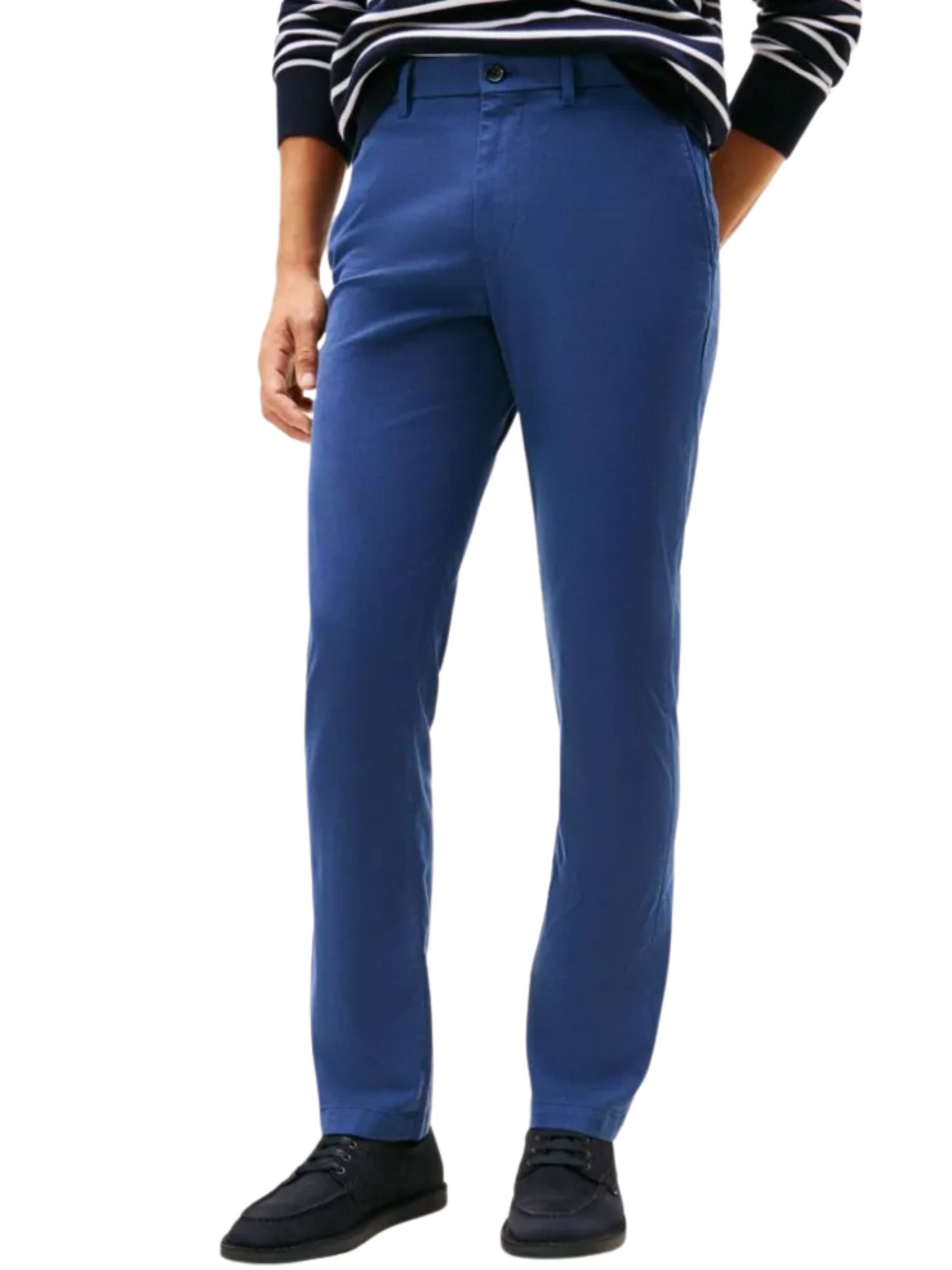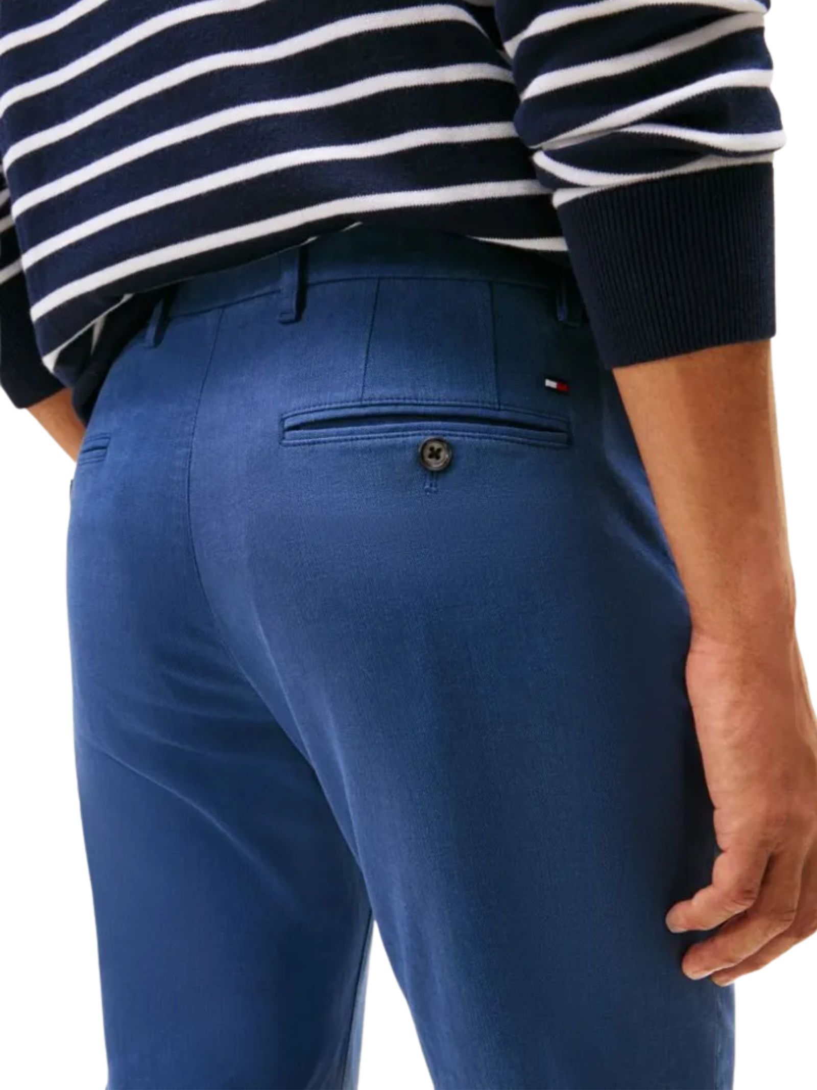 Pantaloni in twill di cotone elasticizzato con chiusura cerniera e bottone, due tasche a bustina angolate in vita e tasca frontale per le monete, rifiniti dalla firma sul fianco Tommy Hilfiger per un look curato e versatile. Composizione: 97% cotone, 3% elastan.