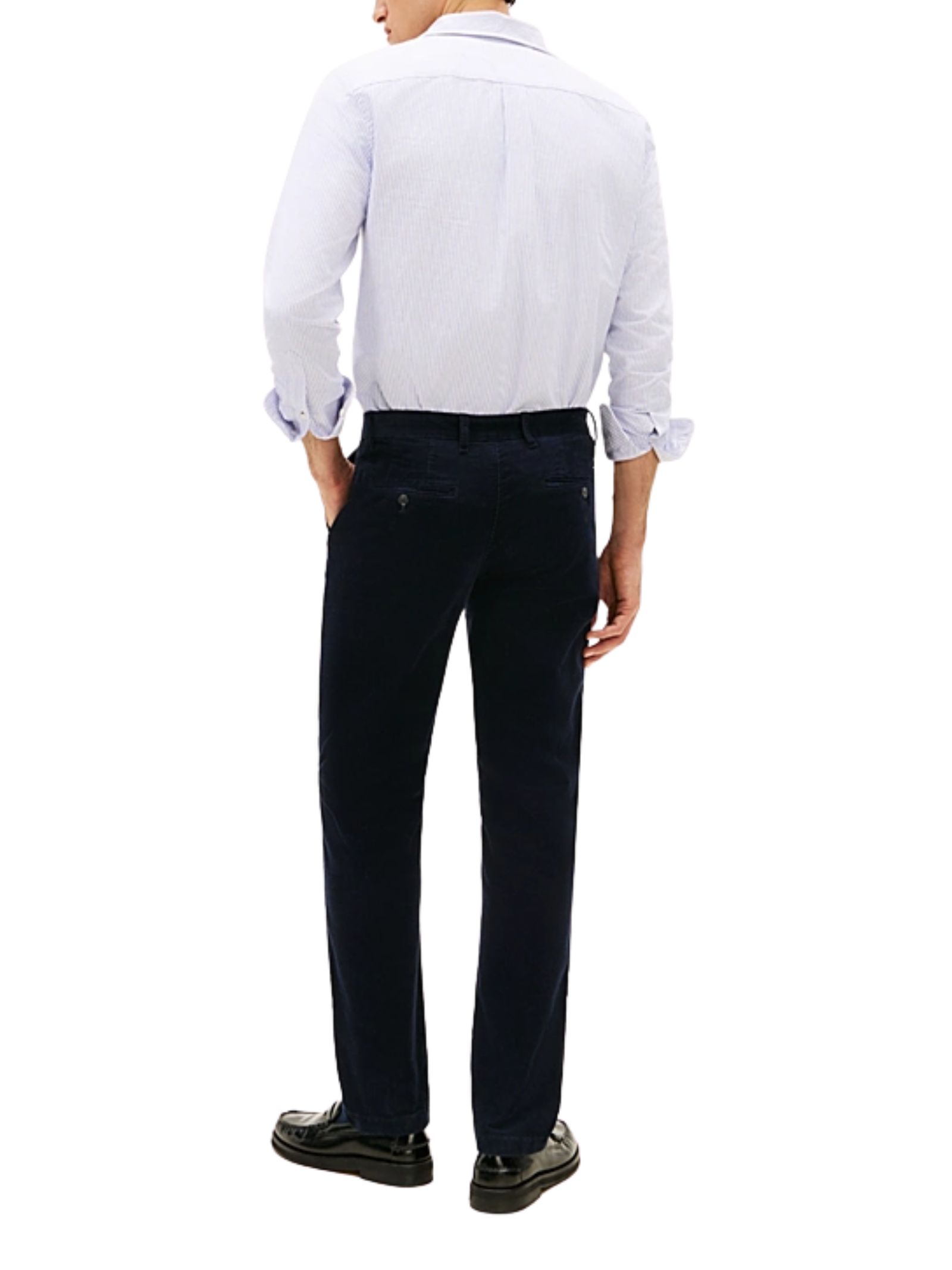 Pantaloni blu Tommy Hilfiger in velluto a coste stretch, caratterizzati da una silhouette dritta che aggiunge una nota di texture agli outfit. Realizzati in velluto a coste di cotone stretch, presentano chiusura con zip e bottone, tasche ad angolo aperte in vita e tasca posteriore con bottone. La bandierina ricamata sul retro offre un tocco distintivo di branding. Con una composizione di 98% cotone e 2% elastan, questi pantaloni garantiscono comfort e resistenza, mentre il modello ha una vestibilità straight.
