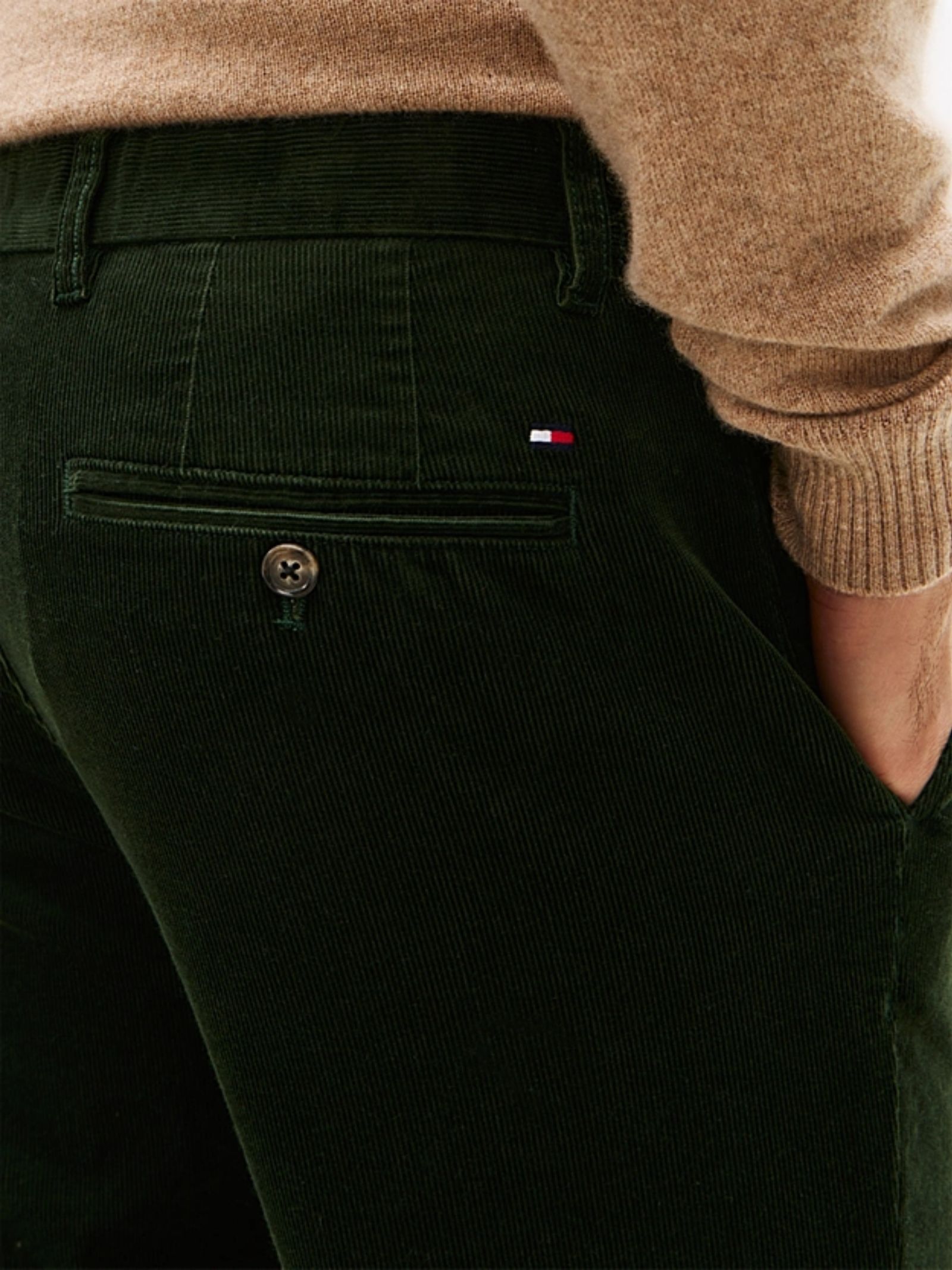 Pantaloni verdi Tommy Hilfiger in velluto a coste stretch, caratterizzati da una silhouette dritta che aggiunge una nota di texture agli outfit. Realizzati in velluto a coste di cotone stretch, presentano chiusura con zip e bottone, tasche ad angolo aperte in vita e tasca posteriore con bottone. La bandierina ricamata sul retro offre un tocco distintivo di branding. Con una composizione di 98% cotone e 2% elastan, questi pantaloni garantiscono comfort e resistenza, mentre il modello ha una vestibilità straight.