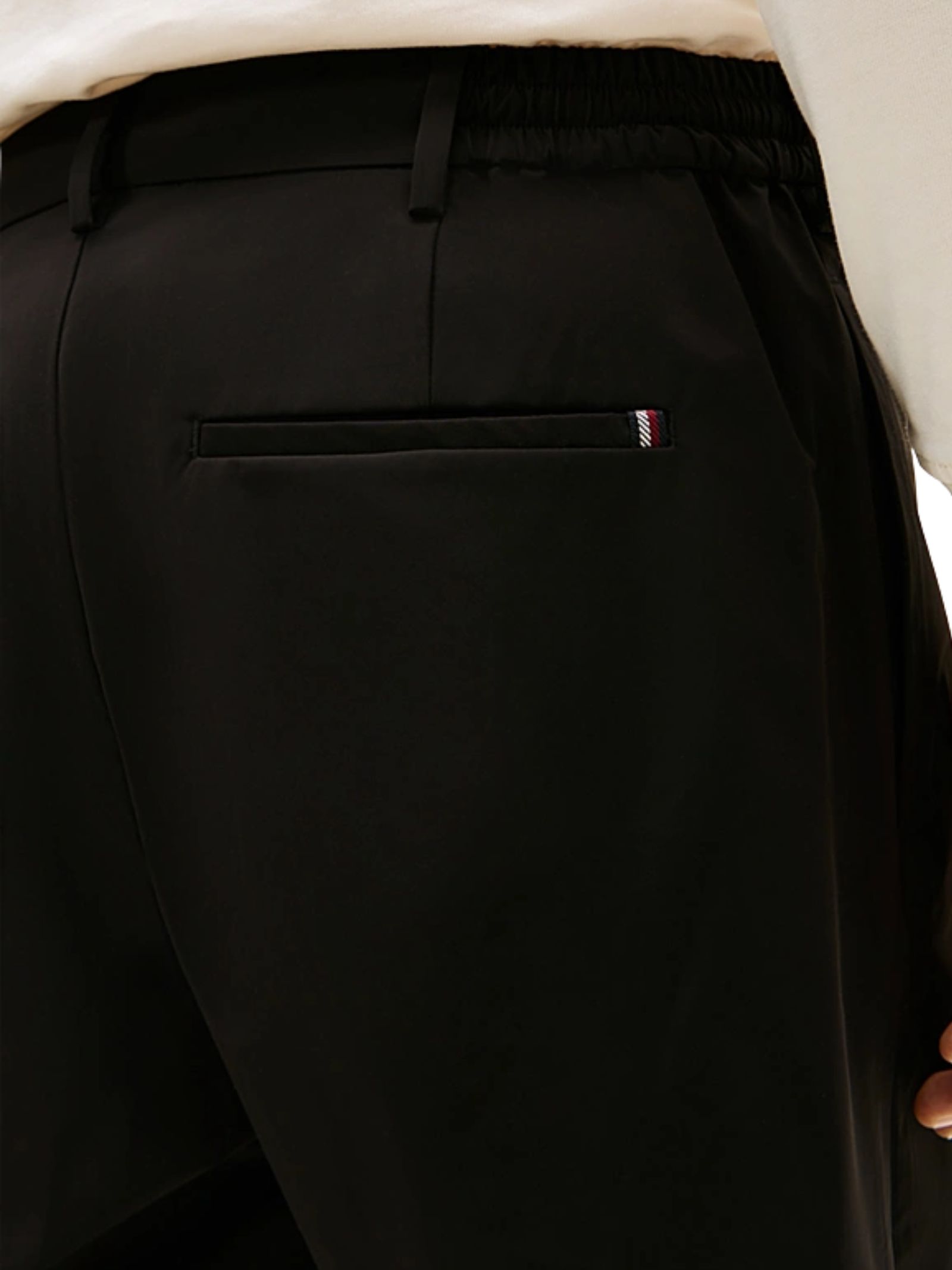 Pantaloni taglio affusolato in tessuto effetto carta con chiusura zip e bottone, due tasche laterali e due a filetto sul retro, vita semielastica e dettaglio iconico sulla tasca posteriore, completati dal branding Tommy Hilfiger per uno stile pratico e contemporaneo. Composizione: 100% poliestere.