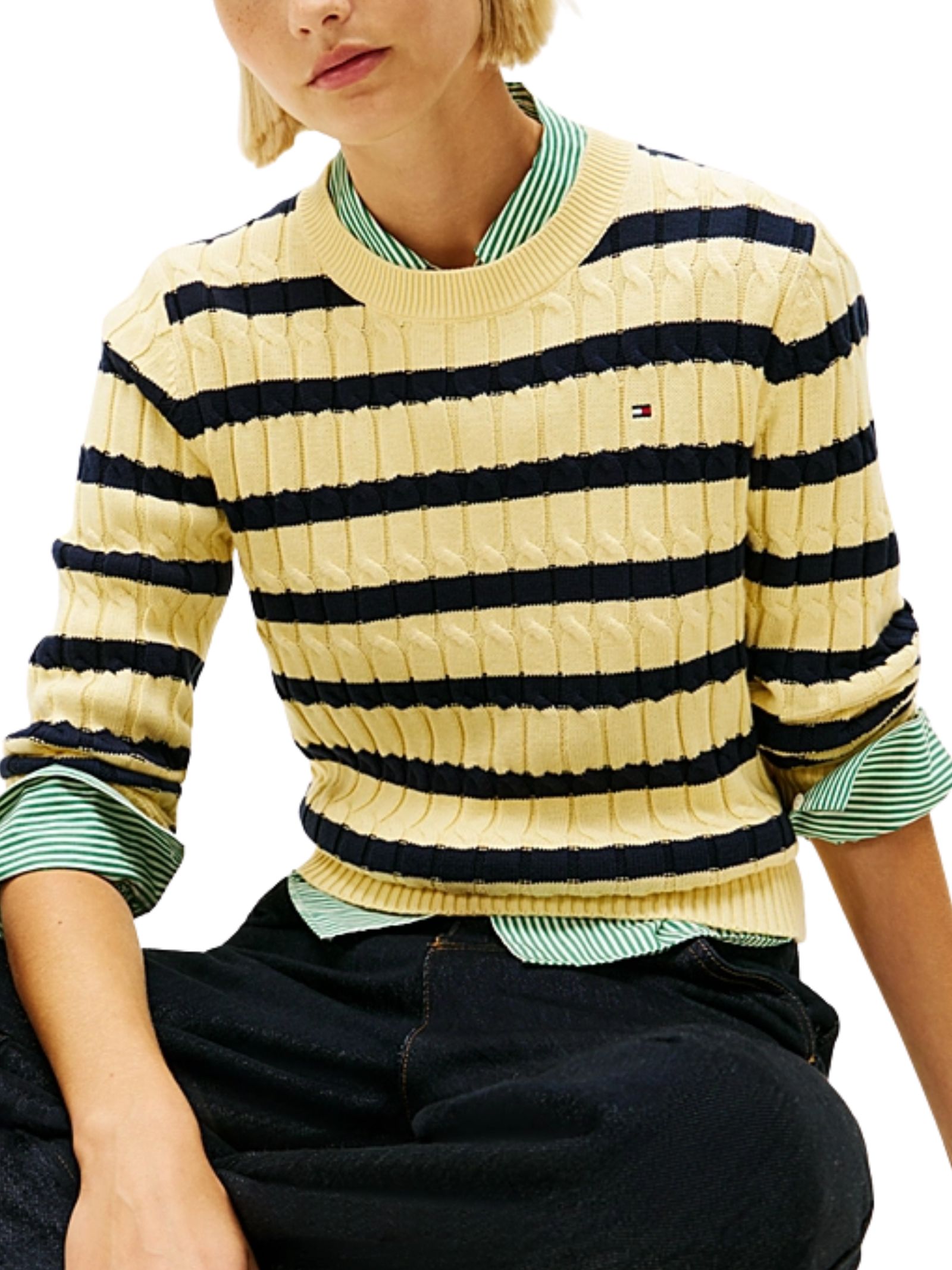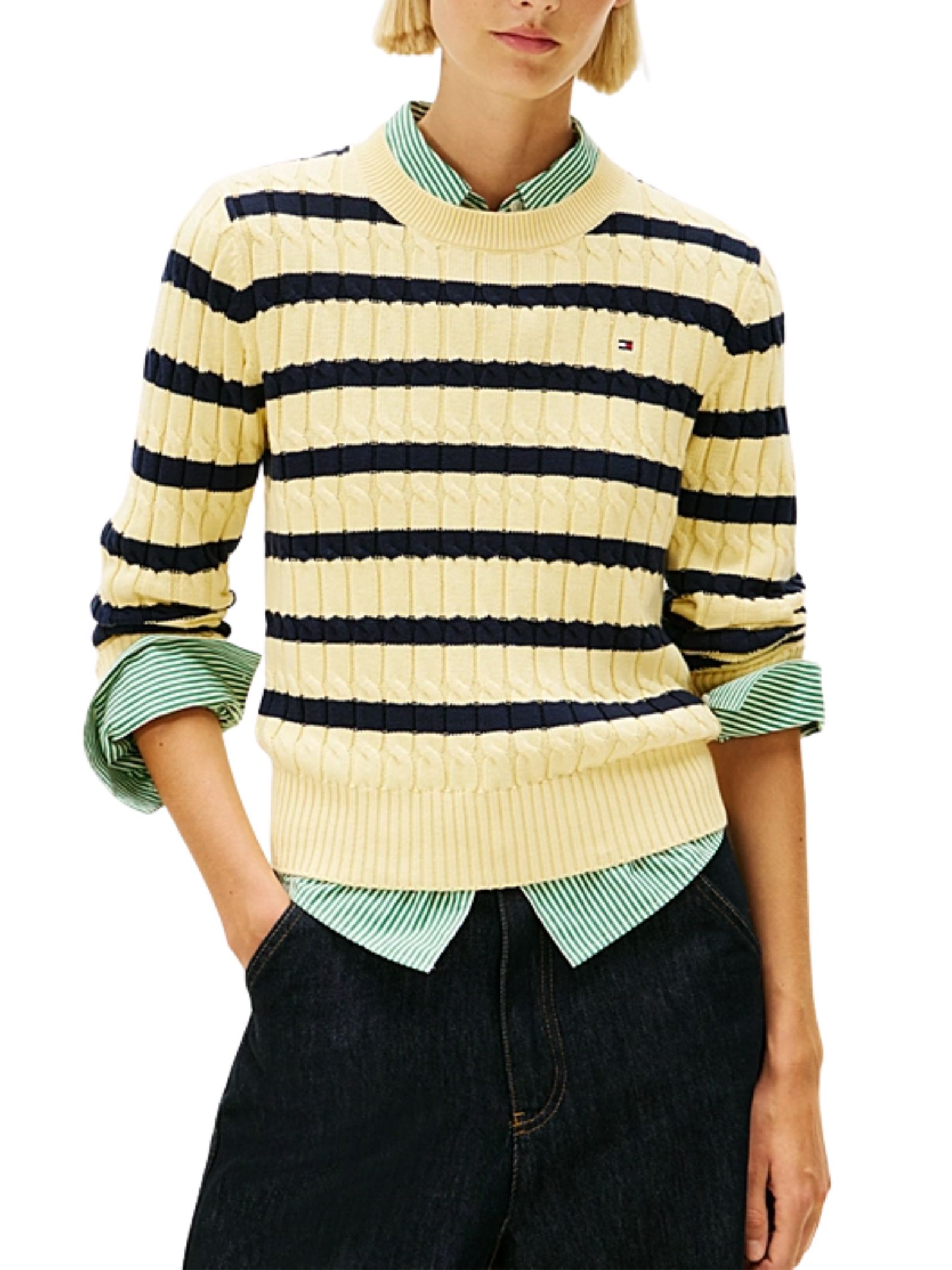 Pullover a maglia intrecciata in puro cotone pettinato di media pesantezza, comodo e stiloso per look a strati, caratterizzato da lavorazione intrecciata all over, girocollo, collo, polsini e fondo a coste, nastro iconico allinterno del collo e branding Tommy Hilfiger con bandierina ricamata sul petto, vestibilità regular. Composizione: 100% cotone.