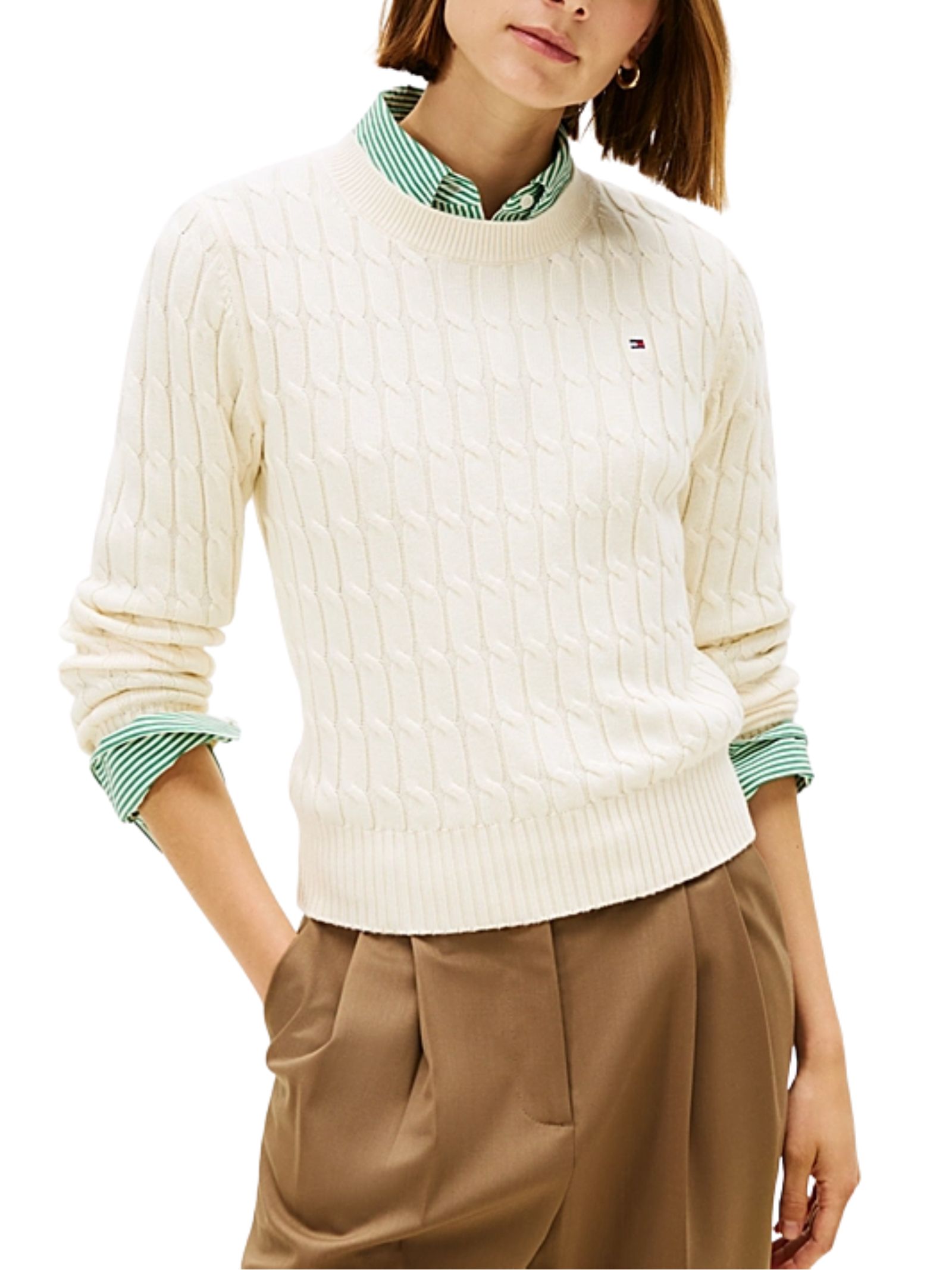 Pullover a maglia intrecciata in puro cotone pettinato di media pesantezza, comodo e stiloso per look a strati, caratterizzato da lavorazione intrecciata all over, girocollo, collo, polsini e fondo a coste, nastro iconico allinterno del collo e branding Tommy Hilfiger con bandierina ricamata sul petto, vestibilità regular. Composizione: 100% cotone.