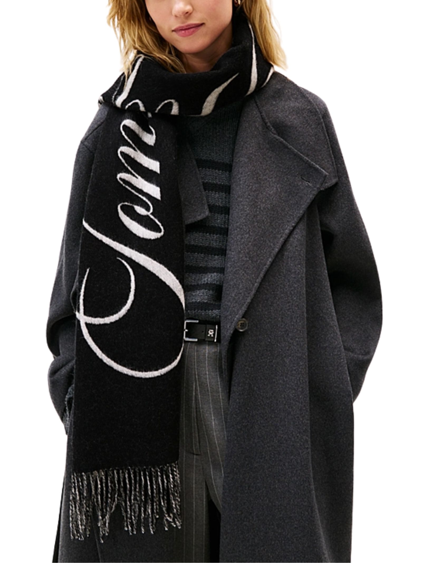 Sciarpa nera in pura lana con bordo sfrangiato e logo Tommy Hilfiger in corsivo sul davanti, dal design elegante e distintivo; dimensioni 210x39 cm, realizzata al 100% in lana.