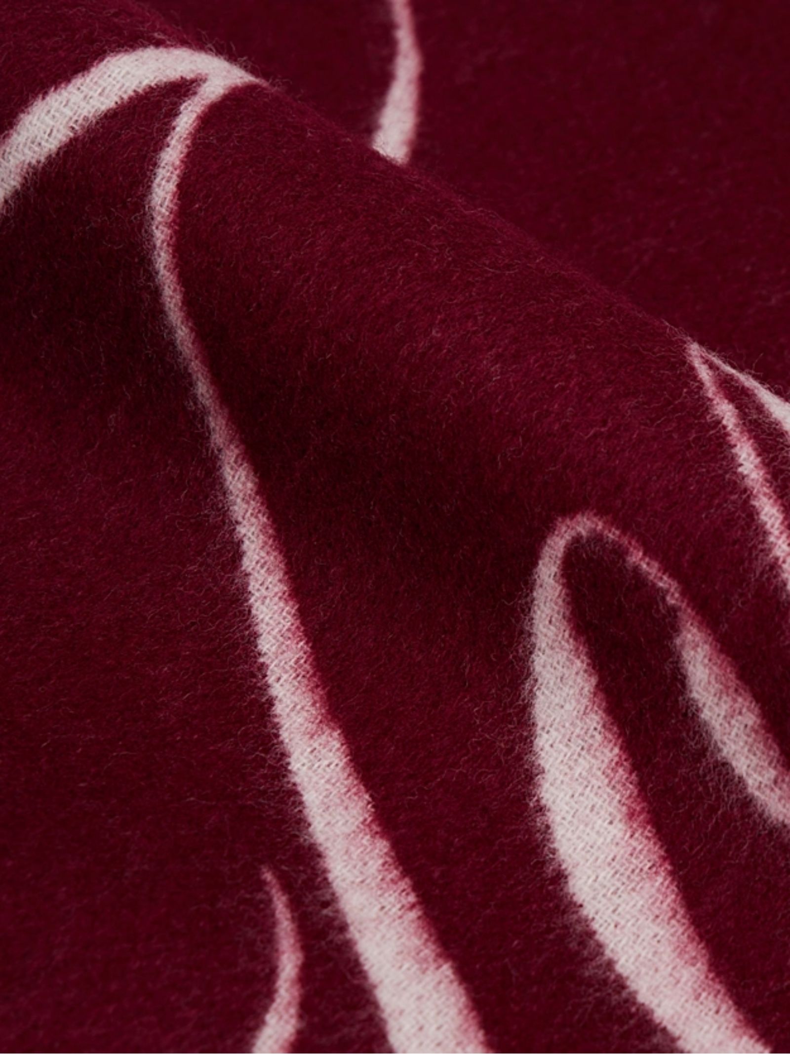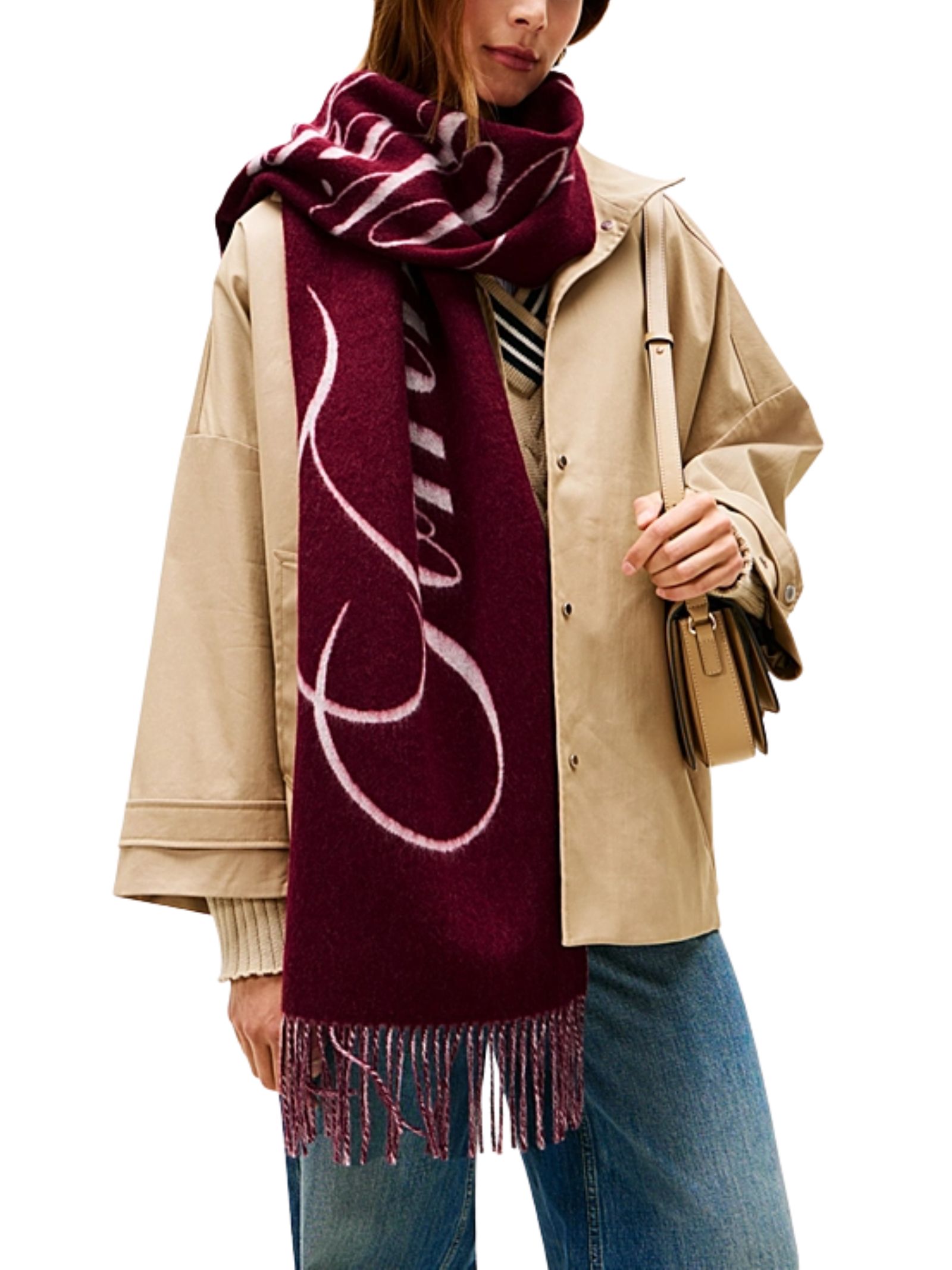 Sciarpa rossa in lana con bordo sfrangiato e logo Tommy Hilfiger in corsivo sul davanti, dal design elegante e distintivo; dimensioni 210x39 cm, realizzata al 100% in lana.