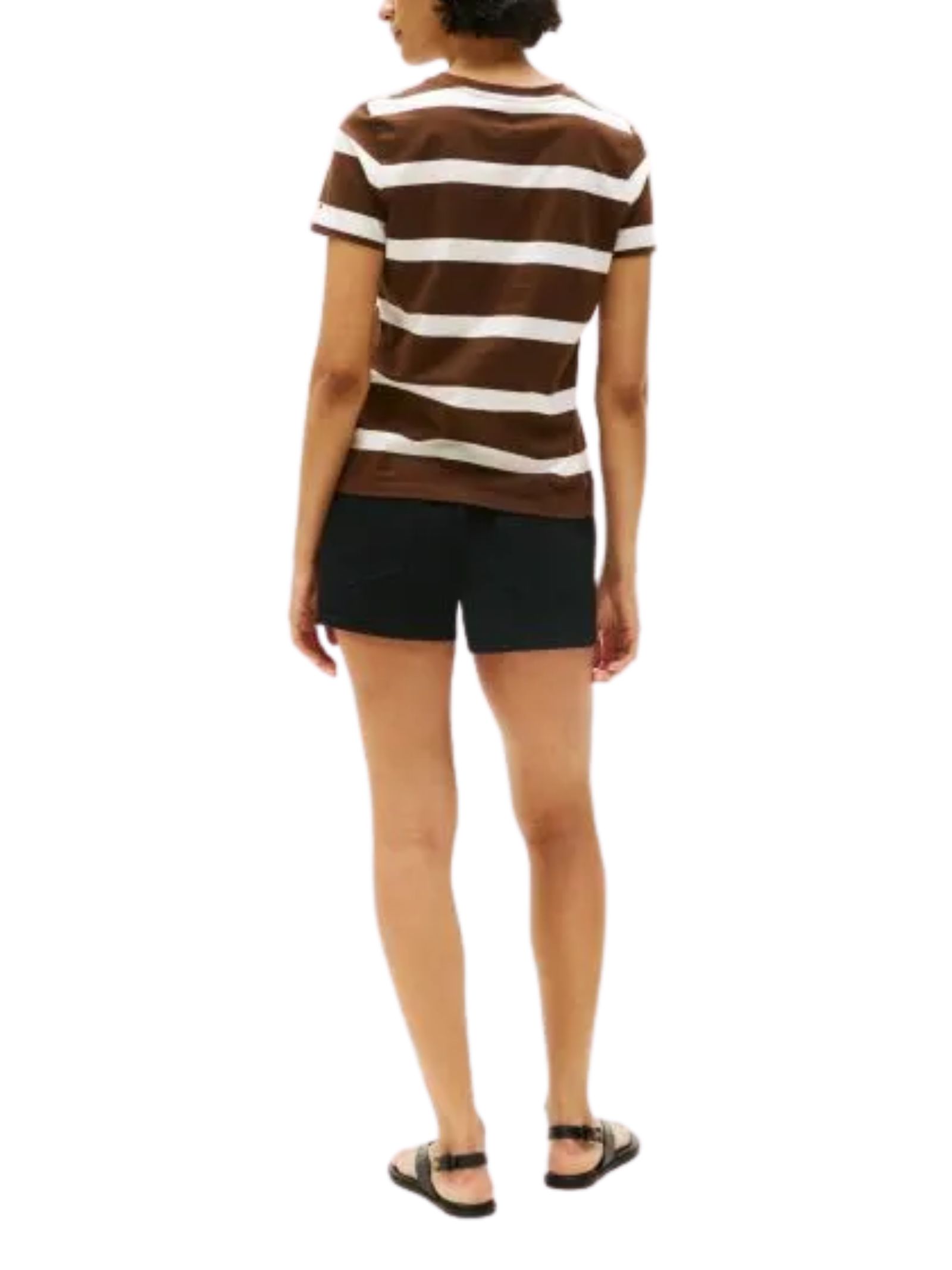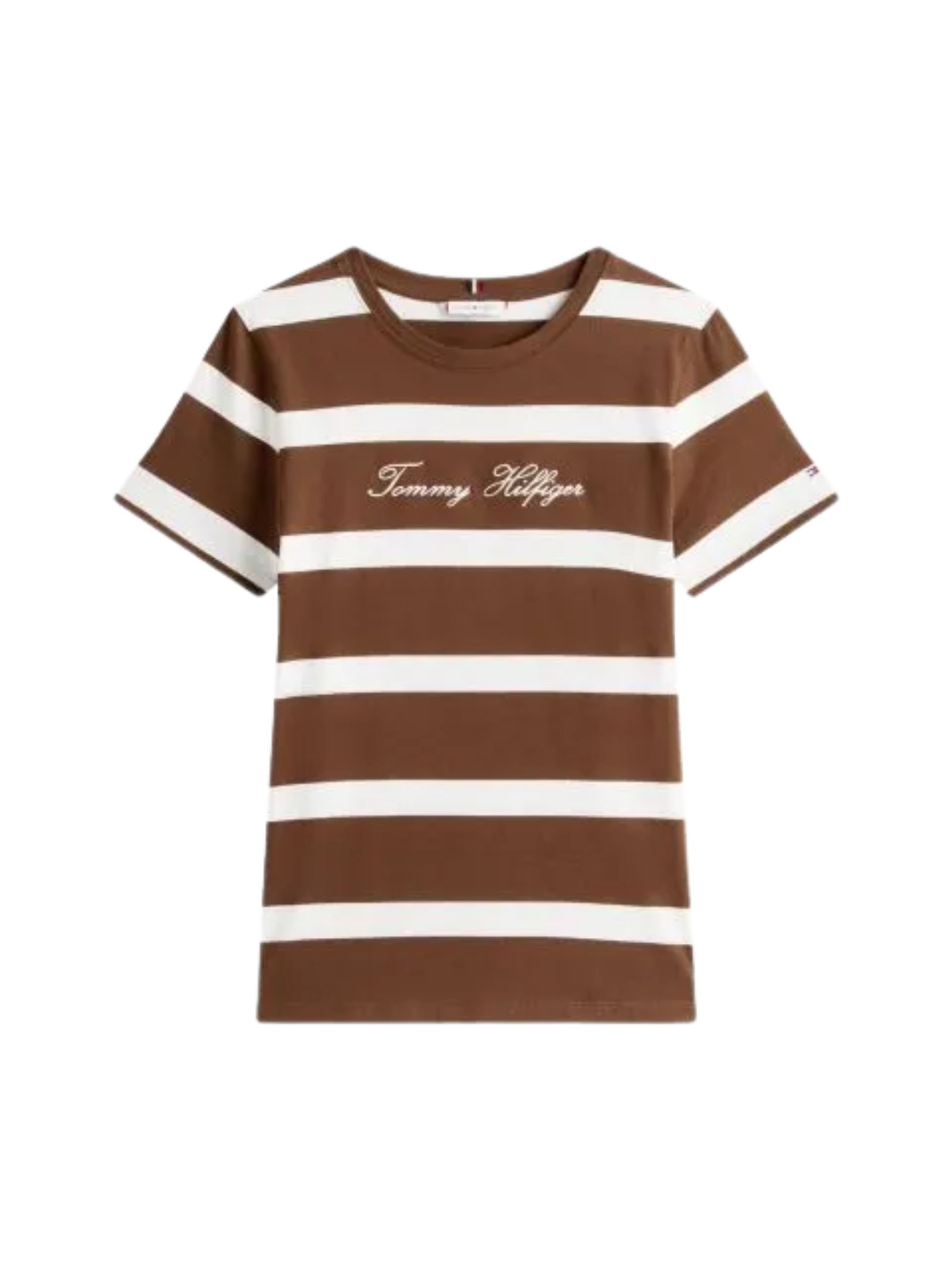T-shirt girocollo a righe in puro cotone con vestibilità regolare, caratterizzata dal logo Tommy Hilfiger ricamato in grassetto sul petto e dal ricamo della bandiera sulla manica, per uno stile esclusivo in un capo essenziale; composizione 100% cotone.
