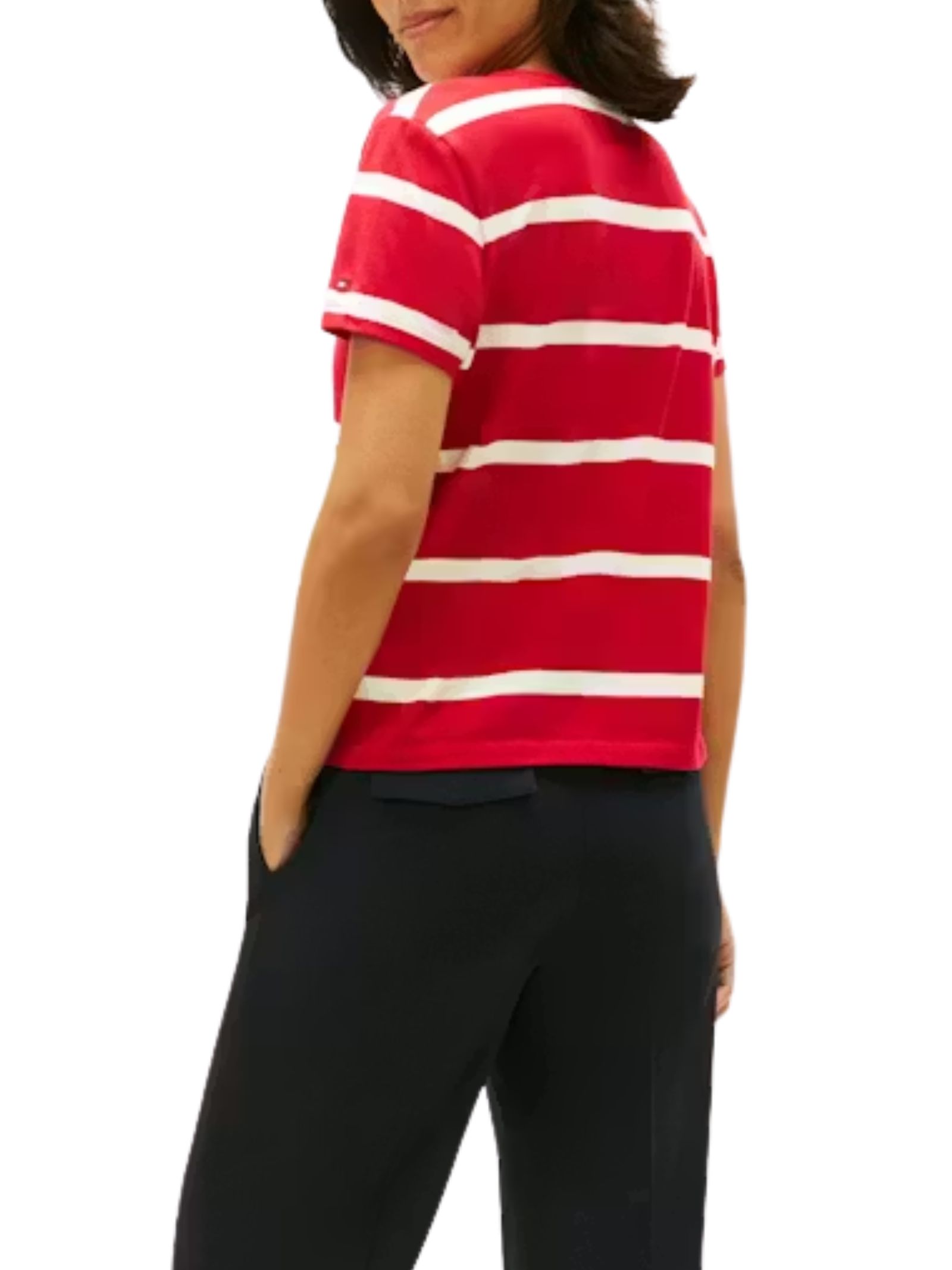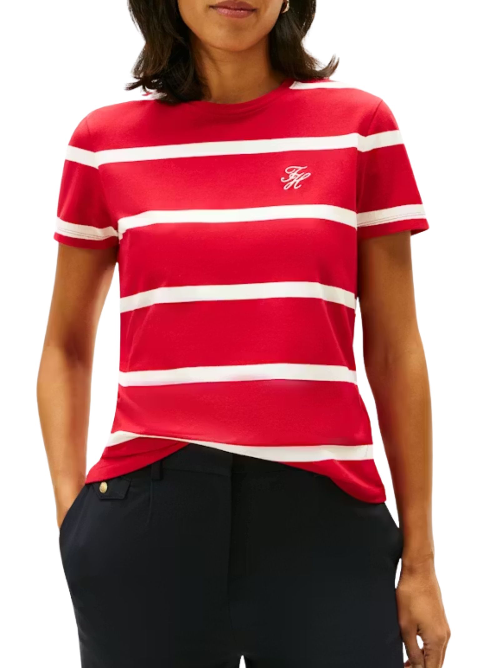 T-shirt girocollo Tommy Hilfiger in jersey di cotone elasticizzato, con vestibilità regolare, ricamo logo sul petto e bandierina Tommy Hilfiger ricamata sul polsino, ideale per un look casual e versatile. Composizione: 95% cotone, 5% elastan.