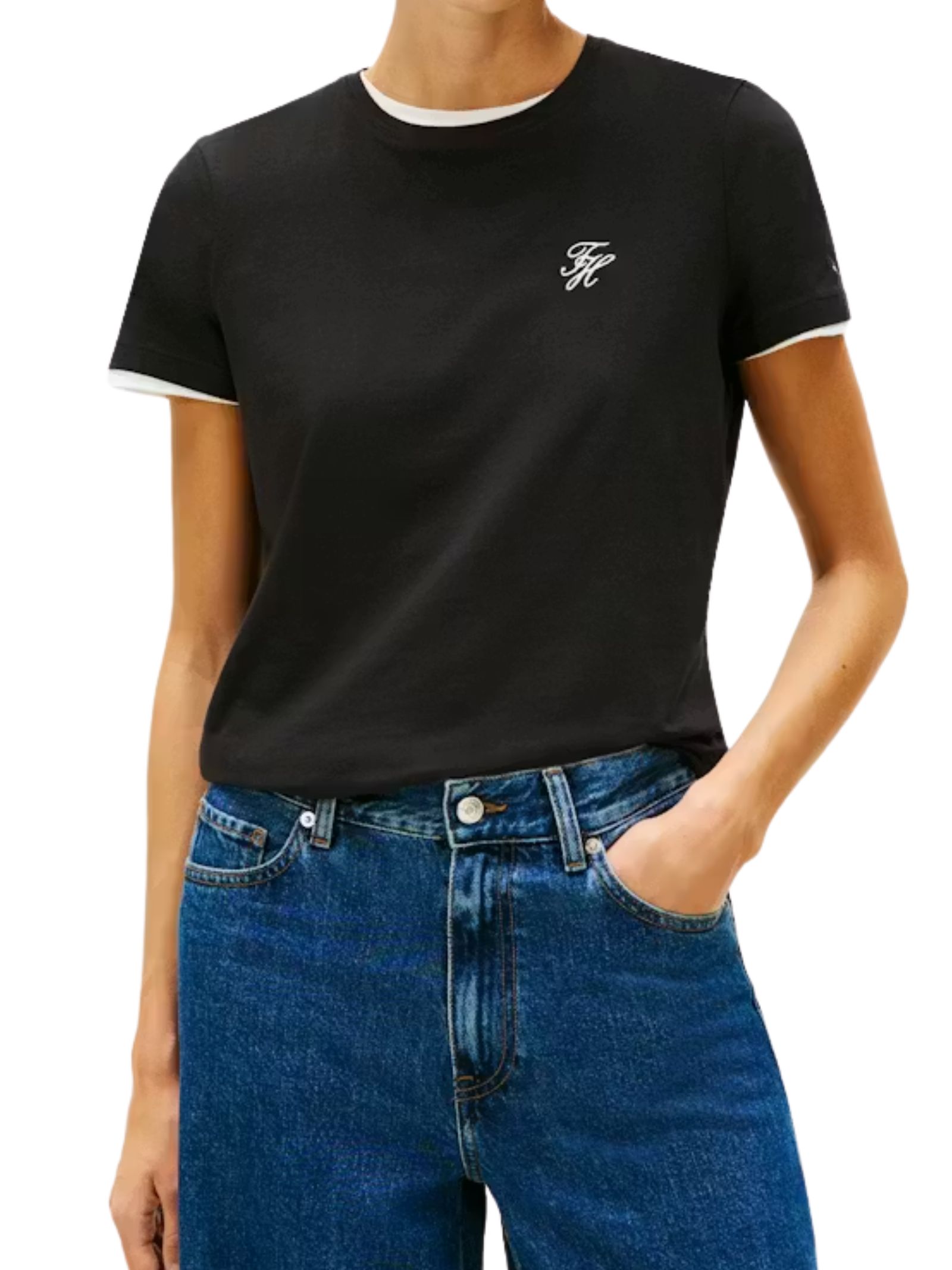 T-shirt girocollo Tommy Hilfiger in jersey di cotone elasticizzato, con vestibilità regolare, ricamo logo sul petto e bandierina Tommy Hilfiger ricamata sul polsino, ideale per un look casual e versatile. Composizione: 95% cotone, 5% elastan.