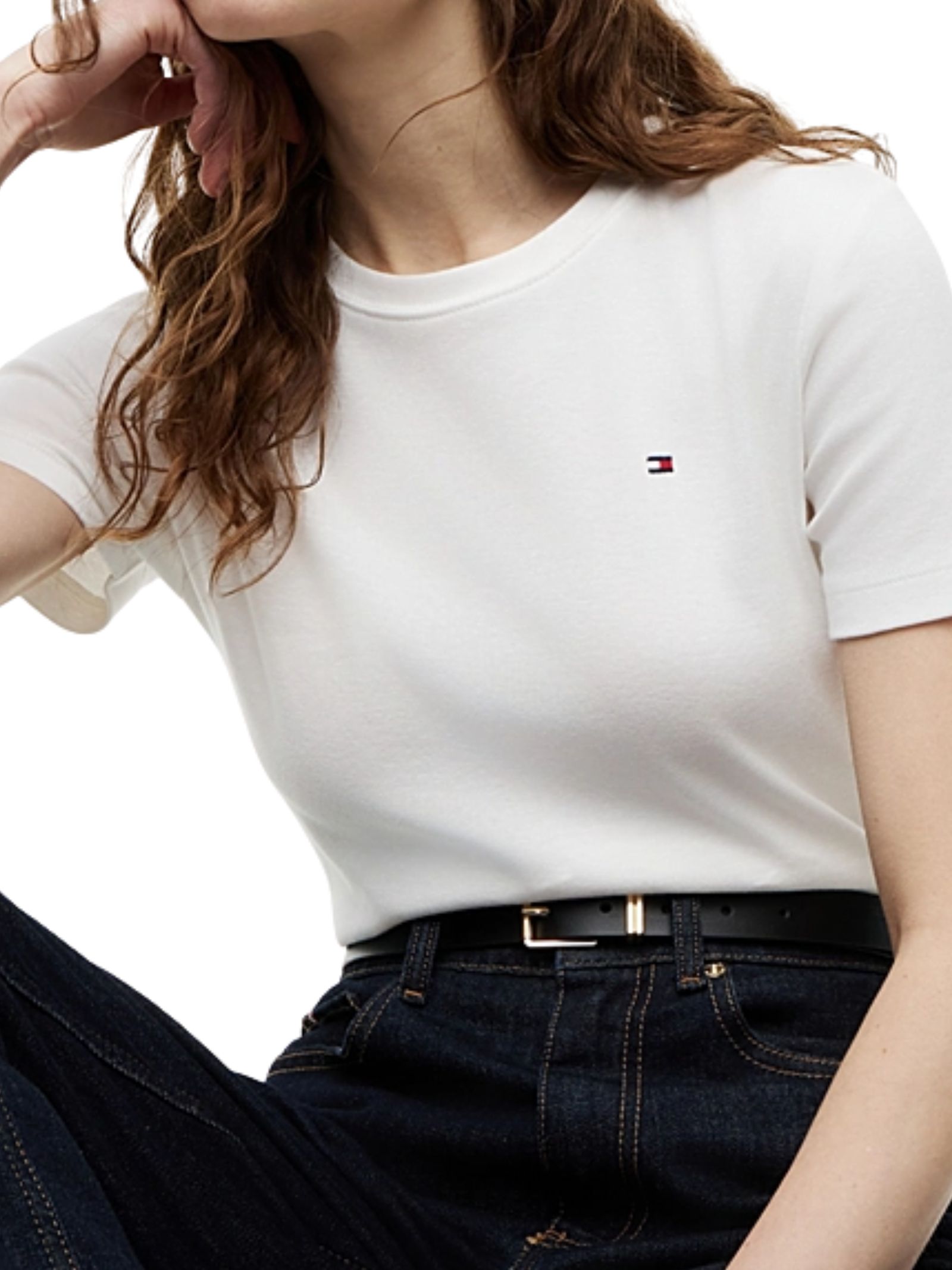 T-shirt girocollo Tommy Hilfiger in puro cotone con finitura effetto seta, slim fit, con bandierina ricamata sul petto per un look pulito e contemporaneo. Composizione: 100% cotone.