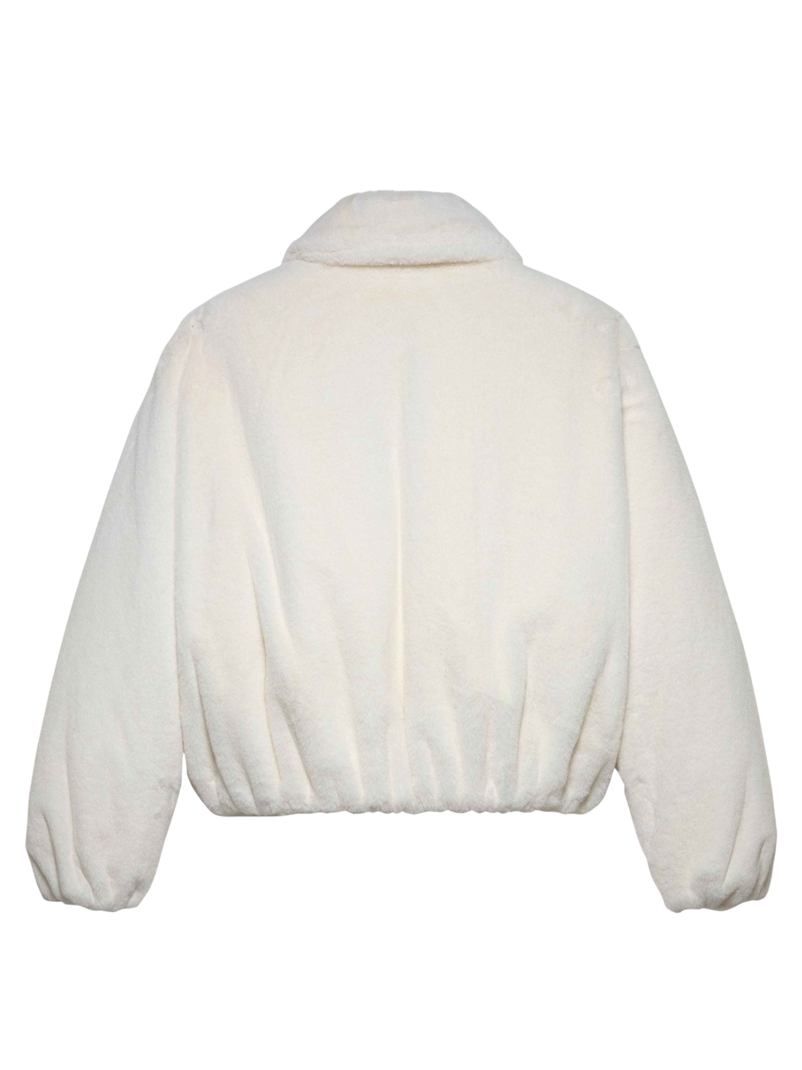 Giubbotto bomber Tommy Jeans bianco in morbida pelliccia sintetica, dal design moderno e caldo. Presenta collo a polo, chiusura con zip e taglio corto. Il logo Tommy Jeans è ricamato tono su tono sul davanti, con dettagli distintivi del brand. Taglio rilassato. Composizione: 70% poliestere riciclato, 30% poliestere.