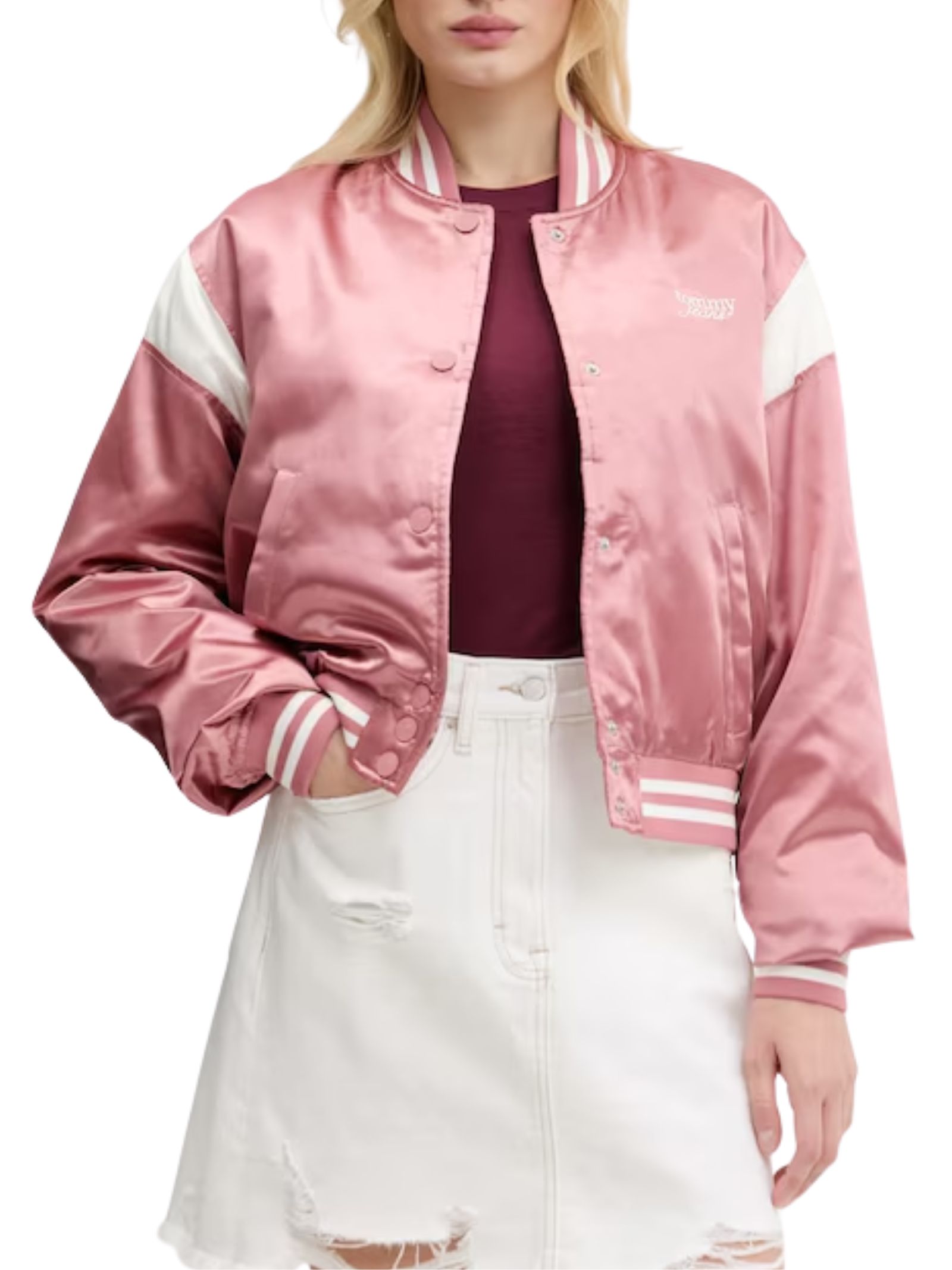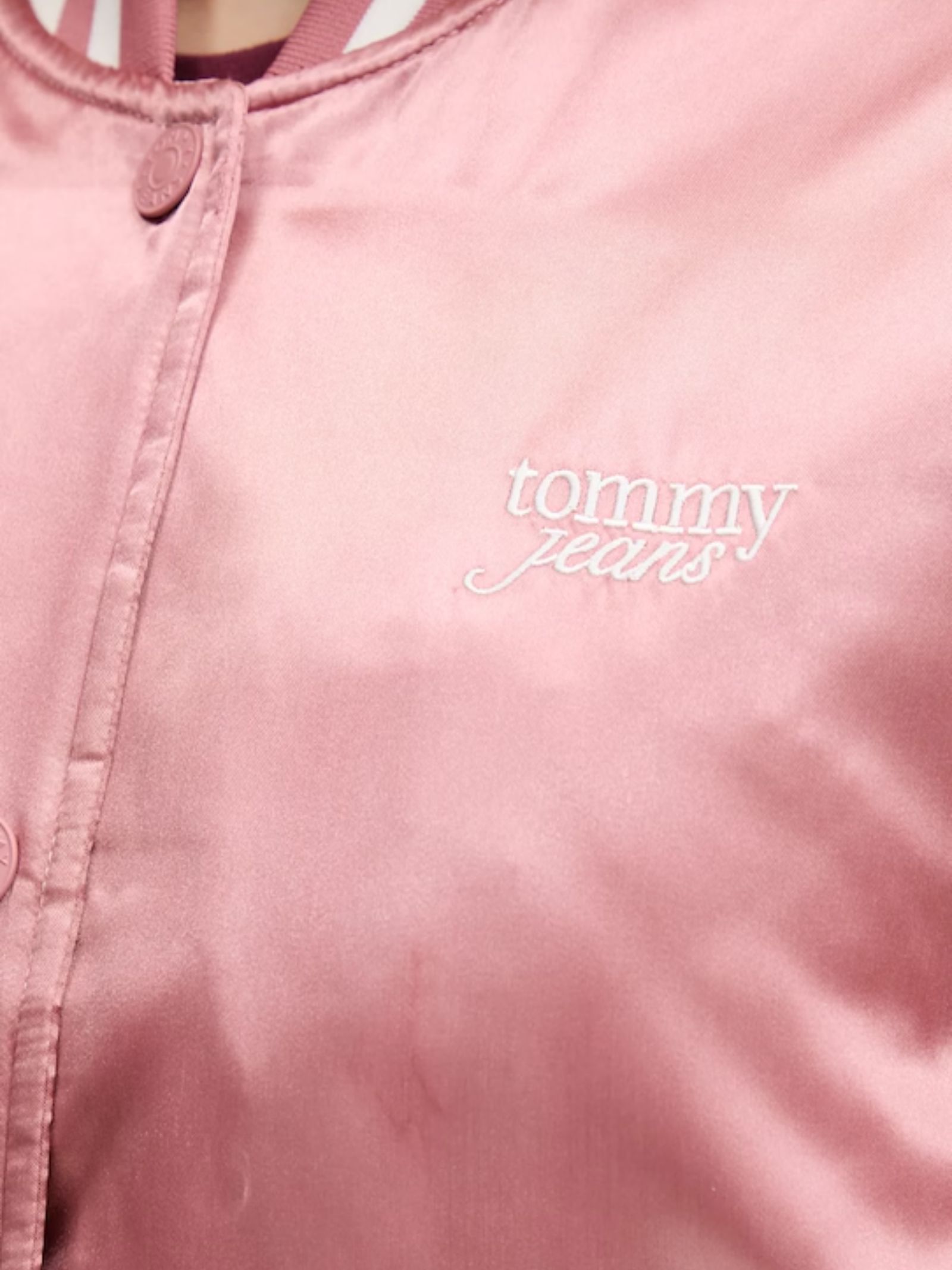 Bomber in stile college Tommy Jeans in tessuto satinato lucido. Colletto, polsini e orlo con righe bianche e rosa. Maniche con dettagli bianchi sulle spalle. Chiusura frontale con bottoni automatici. Vestibilità cropped. Materiale principale: 100% Poliestere Coulisse: 98% Poliestere, 2% Elastan Fodera: 100% Poliestere riciclato