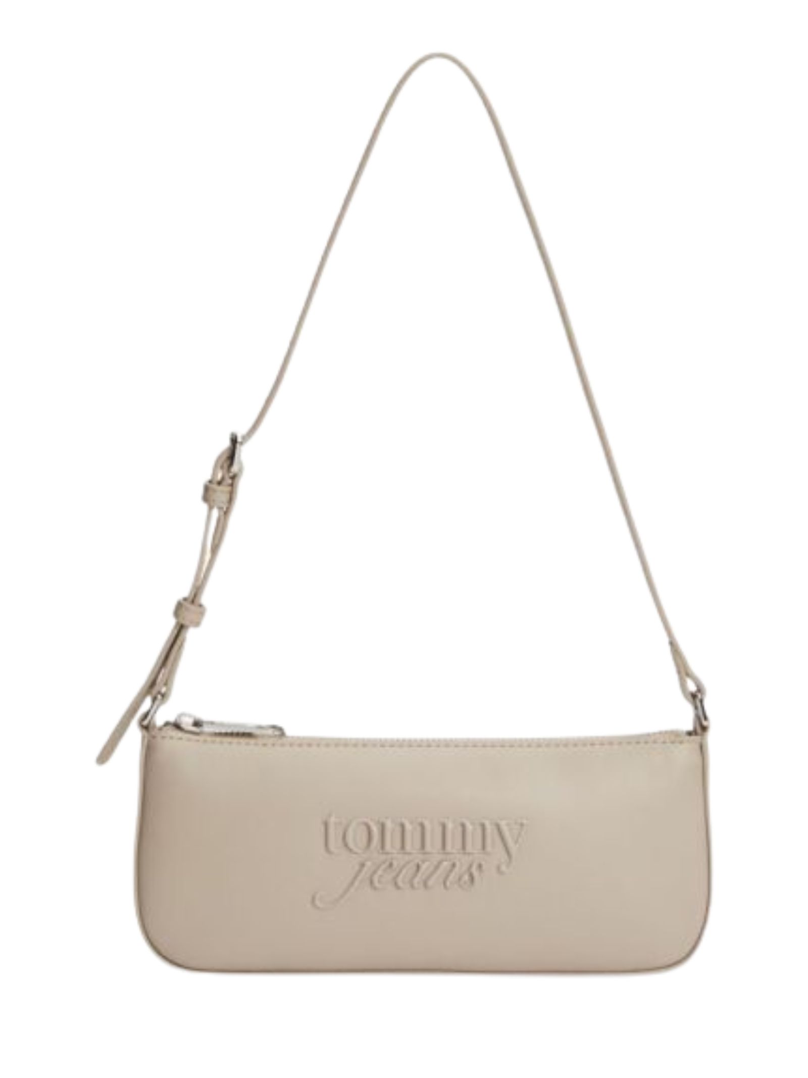 Borsa Tommy Jeans con finitura liscia, chiusura a zip, tracolla regolabile, scomparto principale e logo Tommy in rilievo sul davanti, dimensioni 23,5 x 5, realizzata in 100% poliuretano.
