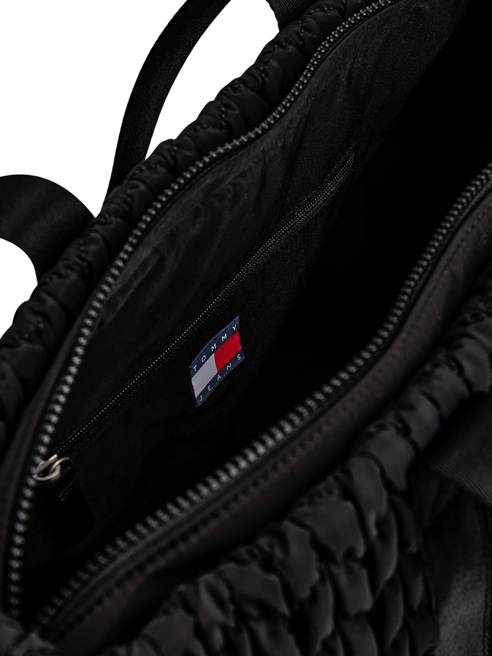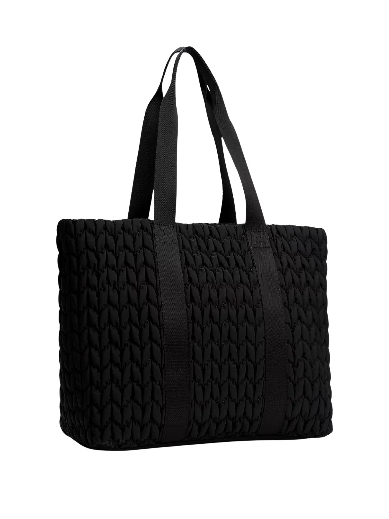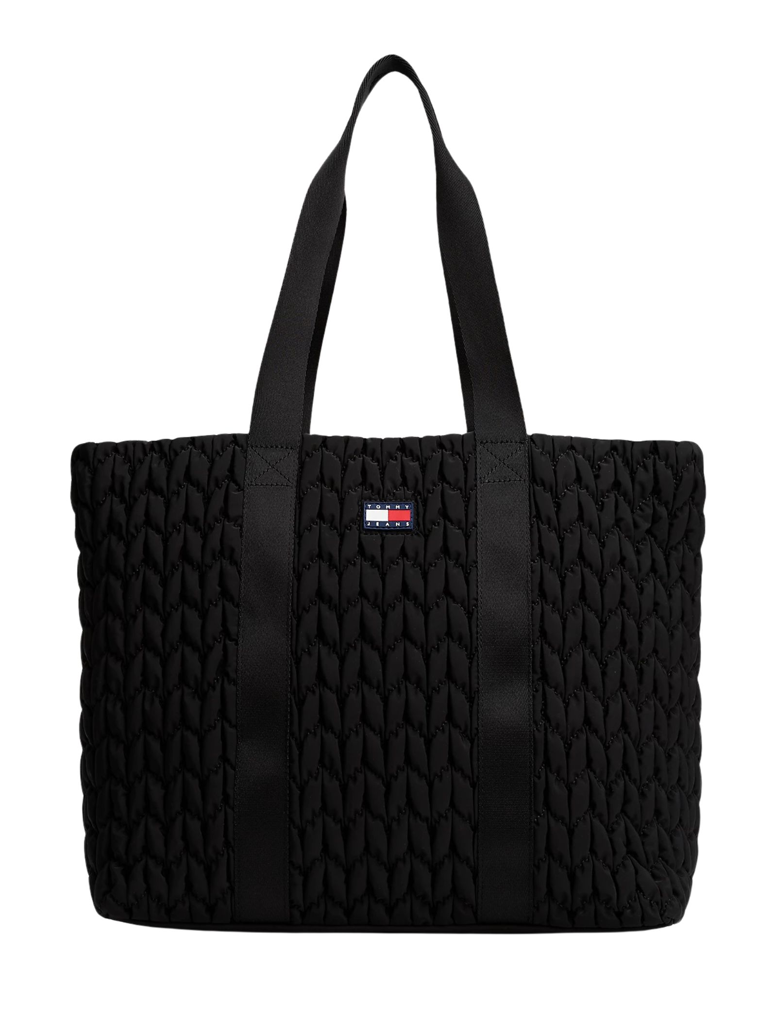 Borsa nera Tote in poliuretano con manici lisci e finitura trapuntata. Logo distintivo gommato frontale. Dimensioni 44x19x33