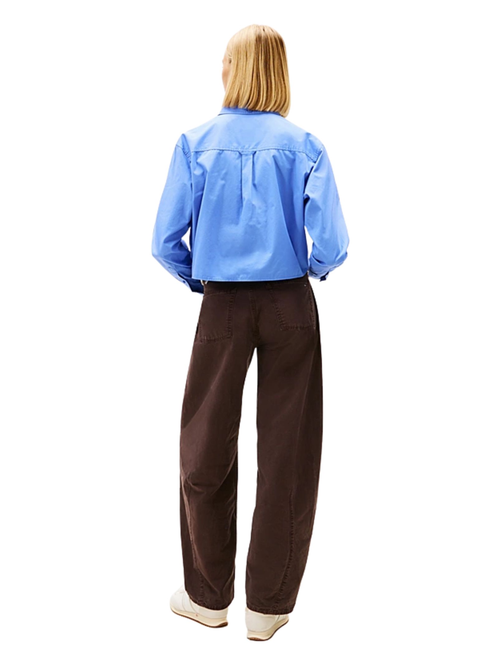 Camicia sofisticata in popeline di puro cotone dallo stile distintivo, caratterizzata da taglio crop e fit ampio, con lavorazione tinta in filo, colletto semifrancese, polsini arrotondati con bottone, piega centrale sul retro, spalle leggermente scese e dettagli iconici Tommy Jeans con bandierina ricamata sul petto. 100% cotone.