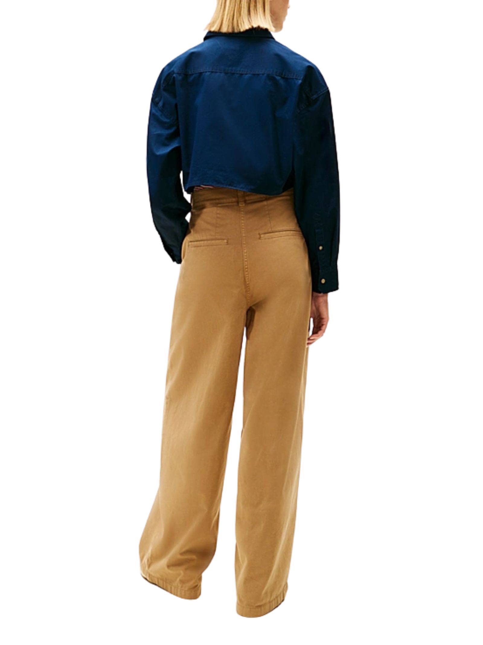 Camicia crop oversize dal design di ispirazione funzionale, realizzata in twill di puro cotone, con colletto semifrancese, polsini smussati con bottone, due tasche con patta sul petto, bottoni in metallo con logo Tommy Jeans in rilievo, spalle scese e dettagli iconici con bandierina ricamata sulla tasca. 100% cotone.